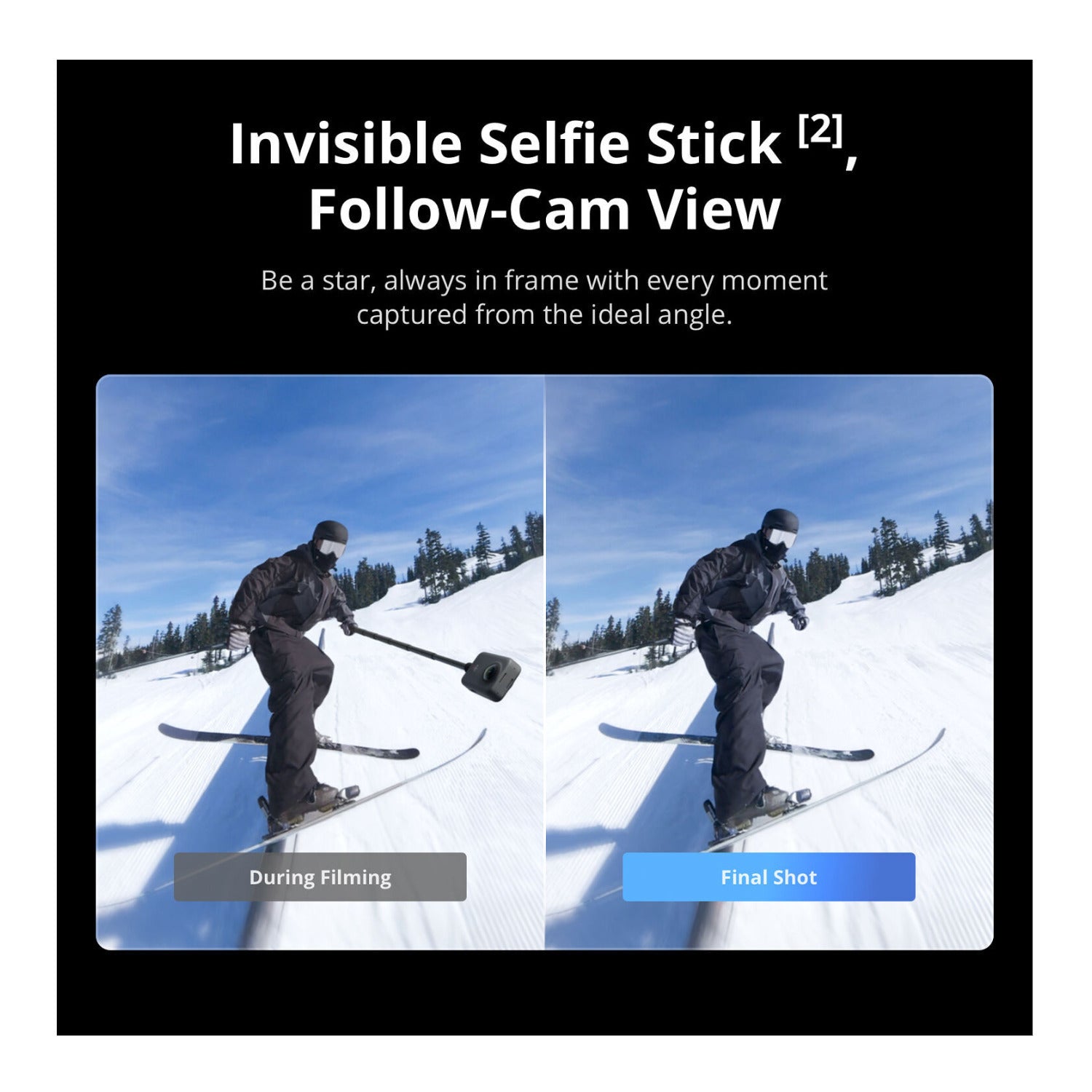 When using a selfie stick, you can capture sweeping 360° videos with the invisible selfie stick effect that removes the stick itself from the video with no post-editing required. This allows you to experience a third-person perspective as if a drone were tracking you.