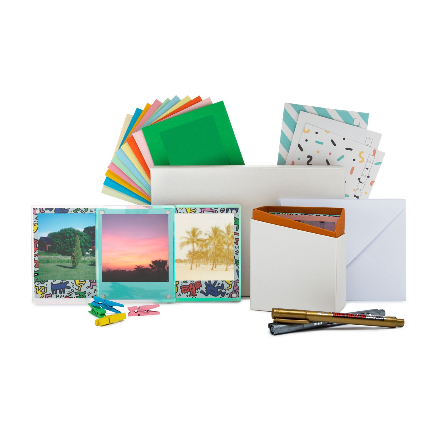 Store and display your instant photos in style with the Focus Camera Polaroid Film Kit for Polaroid i-Type, 600, and SX-70 Cameras. This set provides magnetic and hanging frames, with matching clips, to display your creations. It also includes a standing storage box that holds up to 50 photos.