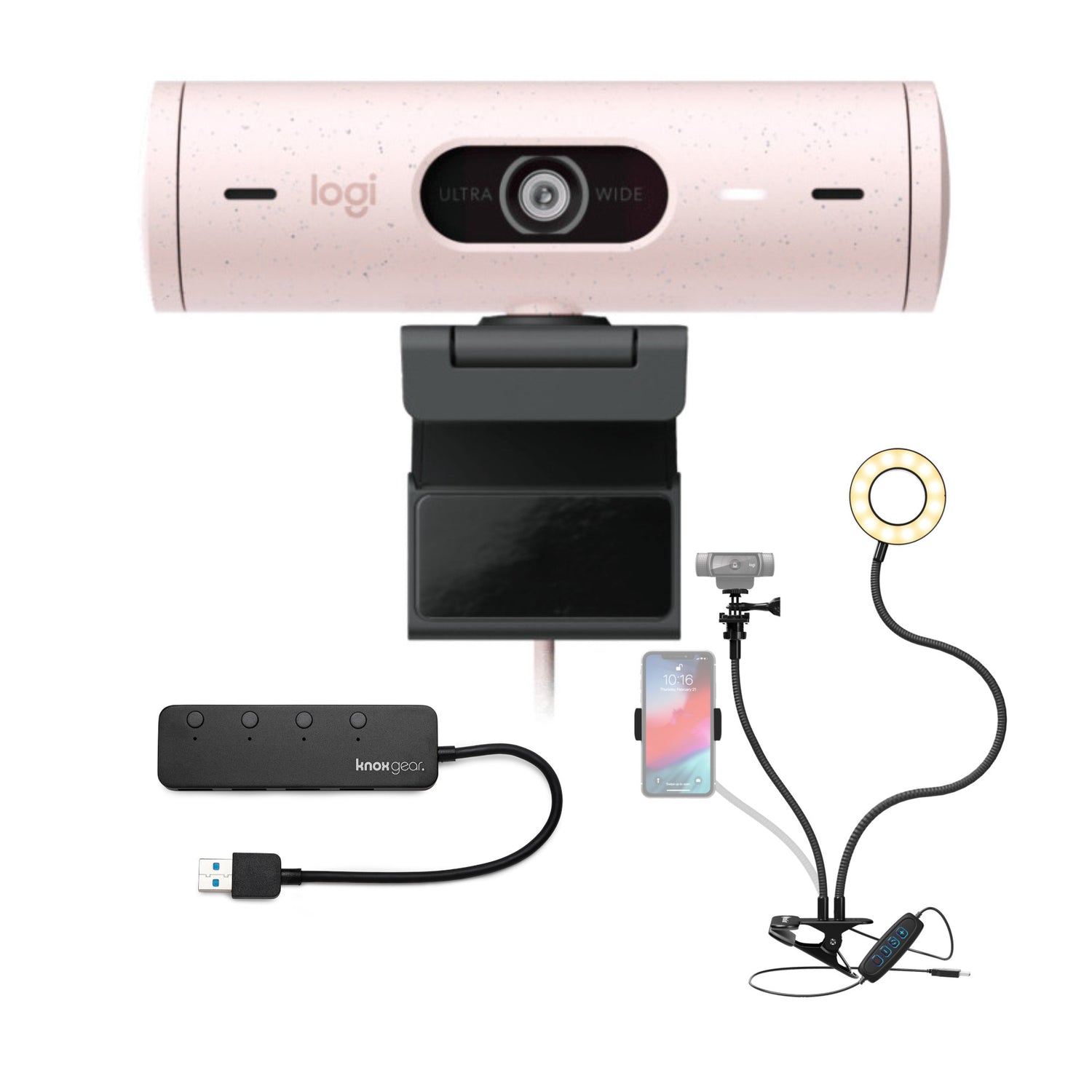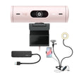 Logitech Brio 500 Webcam with Selfie Ring Light Stand and USB Hub (Rose)