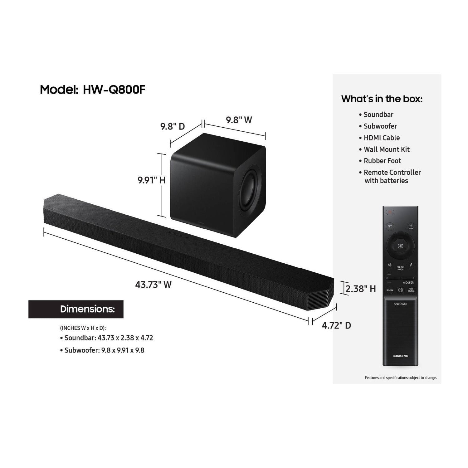 | Net Dimension (Subwoofer) (W x H x D) | 9.8 x 9.9 x 9.8 in |
