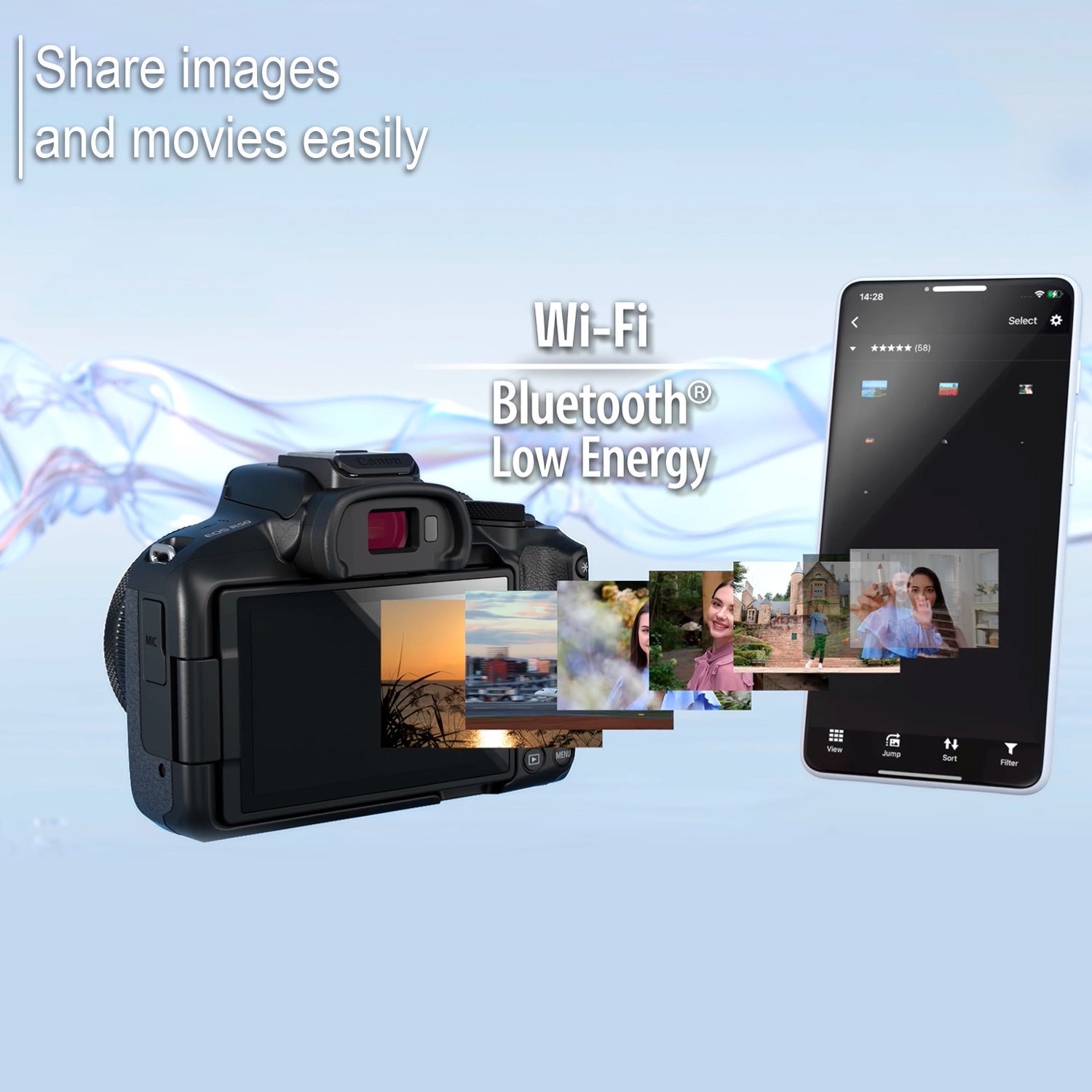 Experience the joy of creative photography with an expanded array of auto-compatible scenes. Advanced A+ Assist on the EOS R50 camera enables great imagery even in difficult settings such as night views and backlit scenarios. Overexposure is automatically reduced so you can capture dynamic scenes or bright portraits, and multiple continuous shots are taken to create beautiful night images or macro photography with a deeper depth of field.