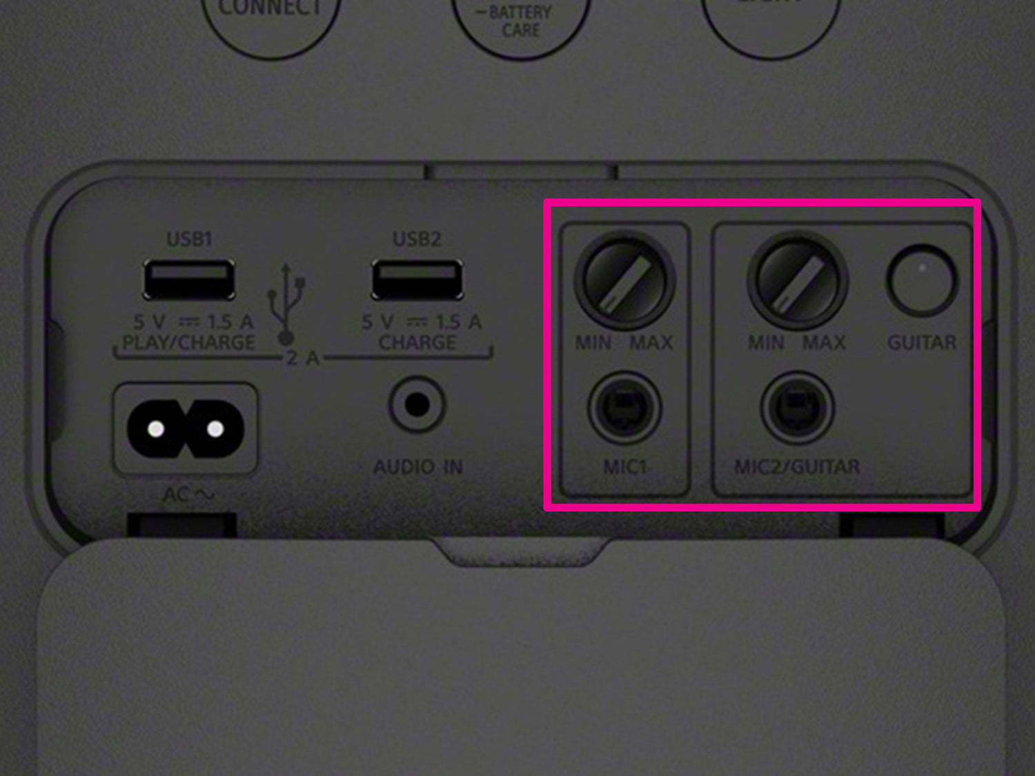 Plug in a microphone or a guitar via the mic/guitar with dual inputs in the rear port. When connecting a guitar, the XP700 can be used as a guitar amp.