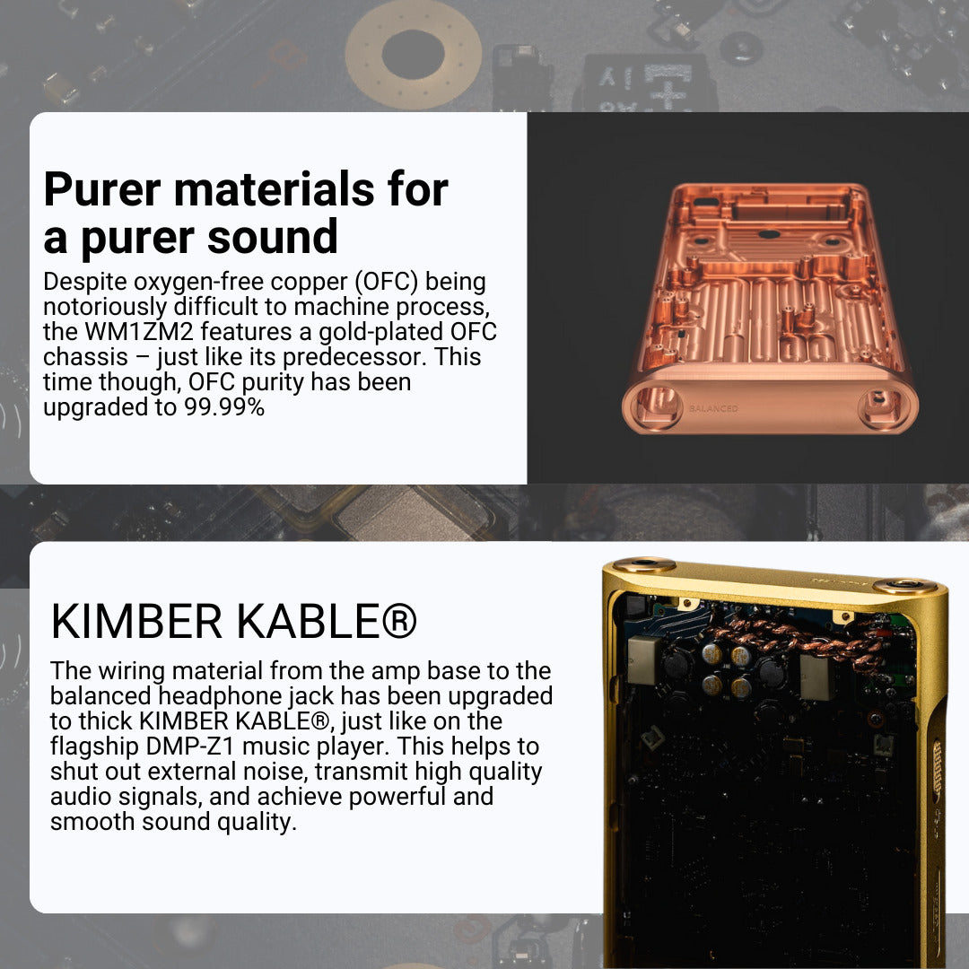 Despite oxygen-free copper (OFC) being a notoriously difficult machine process, the WM1ZM2 features a gold-plated OFC chassis-just like its predecessor. This time though, OFC purity has been upgraded to 99.99%, offering even greater benefits in terms of audio quality and high rigidity. Bass notes are clear and powerful, the atmosphere is more expansive, and mid to high-range sounds linger beautifully.
