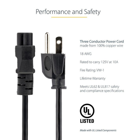 StarTech 3 Feet Laptop Power Cord, NEMA 5-15P to C5, 10A 125V, 18AWG, Laptop Charger Cord