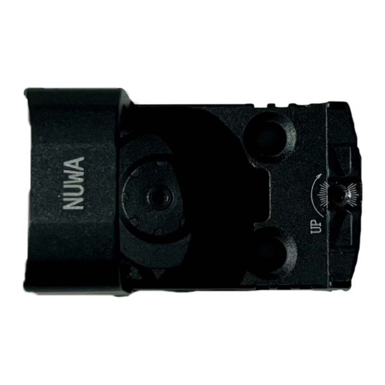 The NUWA Pro has a fixed 66 MOA circle with 3 MOA dots which cannot switch between. It is one of the lightest weight and smallest RMS footprint green dots with full metal construction, top battery loading, and motion-activated function. With Motion Activated System, while the NUWA Pro is turned on, the green reticle illumination goes to sleep after five minutes of inactivity, but when any motion or vibration is detected, it instantly switches on the illumination at the previous brightness setting. Operates with a single CR1632 battery. 6 daylight brightness settings and 1 NV setting. The Night Vision Dot is not visible to the human eye, it can only be seen through a Night Vision eyepiece or goggles. Battery life up to 10000 hours. ADE NUWA Pro created an iron sight curve at the end of the body and also added two white dots on the curve. For the rear part of the red dot to become a backup iron sight. With the ultra-short design, the red dot provides a distance or gap on some full-size optics-ready pistols, to give enough distance to be a Co-Witness backup sight, in addition to the LED dot and pistol-equipped iron sight.
