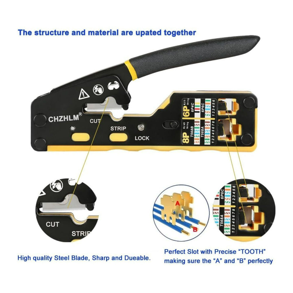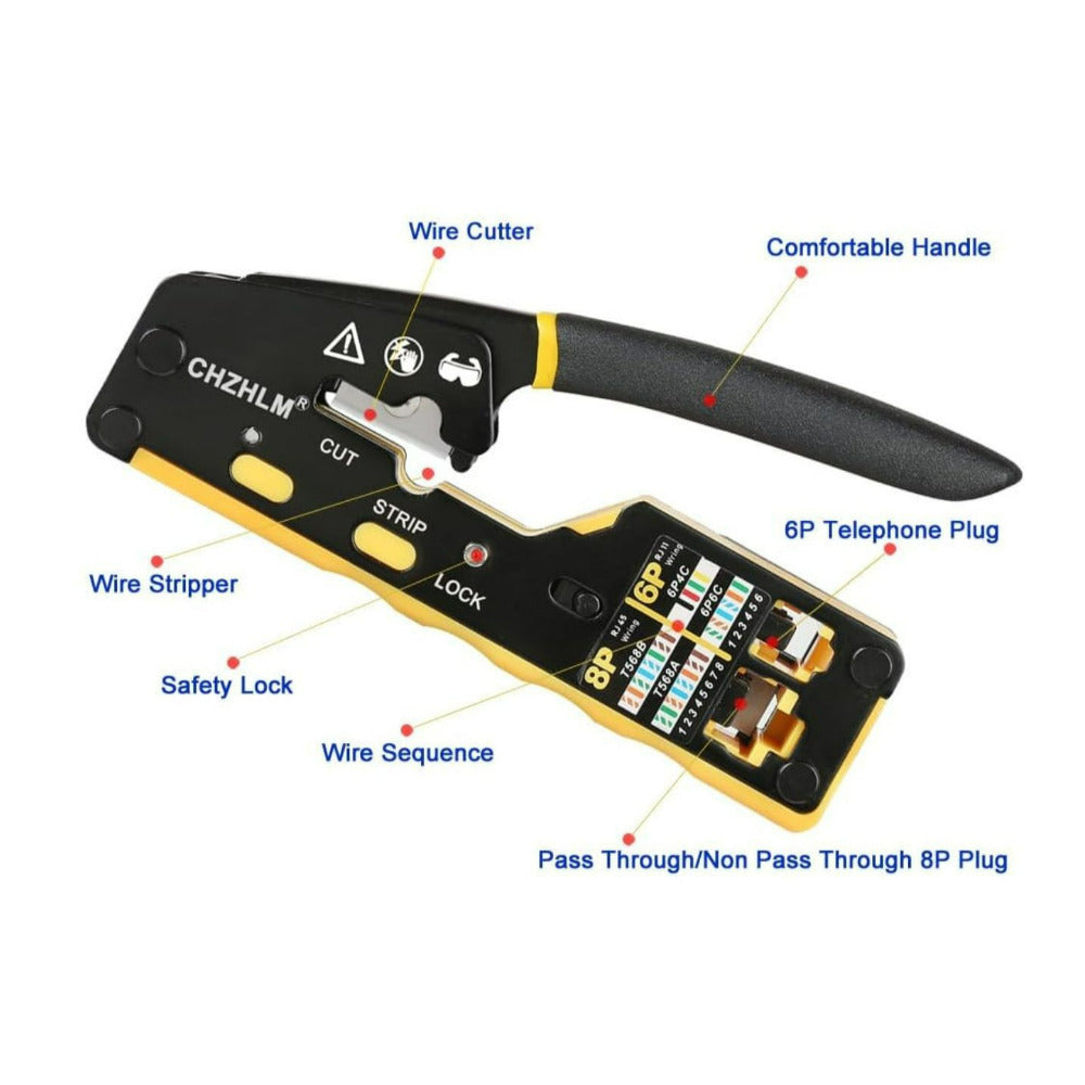 RJ45 Pass Through Crimper Kit with High Carbon Steel Blades for Cat7, Cat6, and Cat5 Connectors