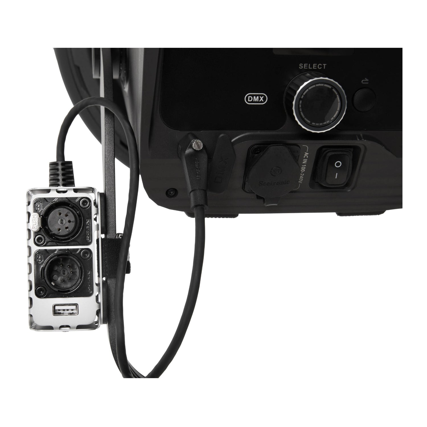 This USB-C to 5-pin DMX in and out adapter is designed for the Ray 360c and 660c fixtures, enabling precise wired 8-bit DMX512 control through a secure locking USB-C connection. Built with durable metal construction and a lightweight profile, it integrates seamlessly into advanced lighting setups, allowing full console or software-based control. The adapter features flexible mounting options with hook-and-loop straps or the integrated 1/4-20 inch screw for stable attachment to handles, yokes, or stands. A USB-A port supports easy firmware updates for enhanced workflow reliability.