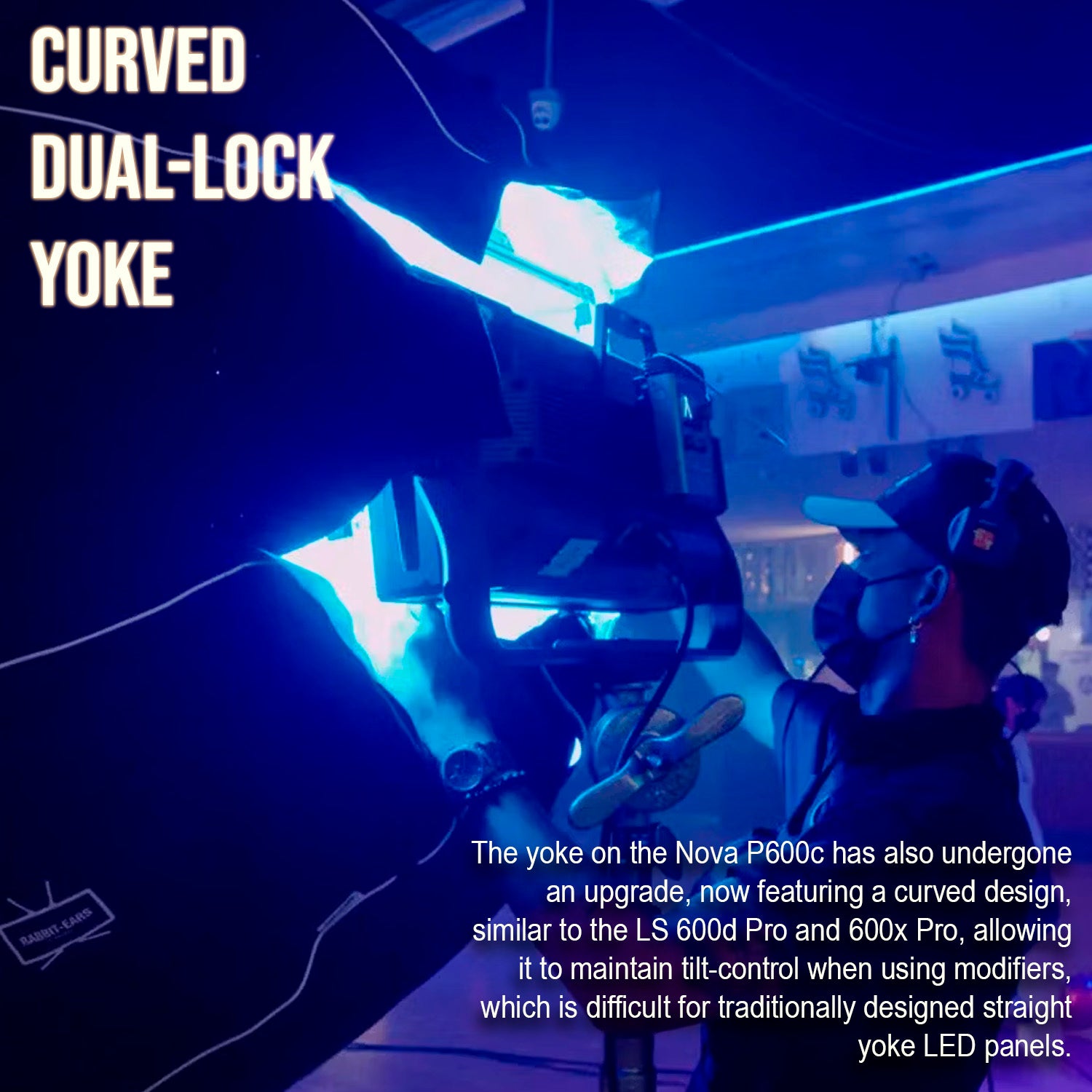 The yoke on the Nova P600c has also undergone an upgrade, now featuring a curved design, similar to the LS 600d Pro and 600x Pro, allowing it to maintain tilt-control when using modifiers, which is difficult for traditionally designed straight yoke LED panels.