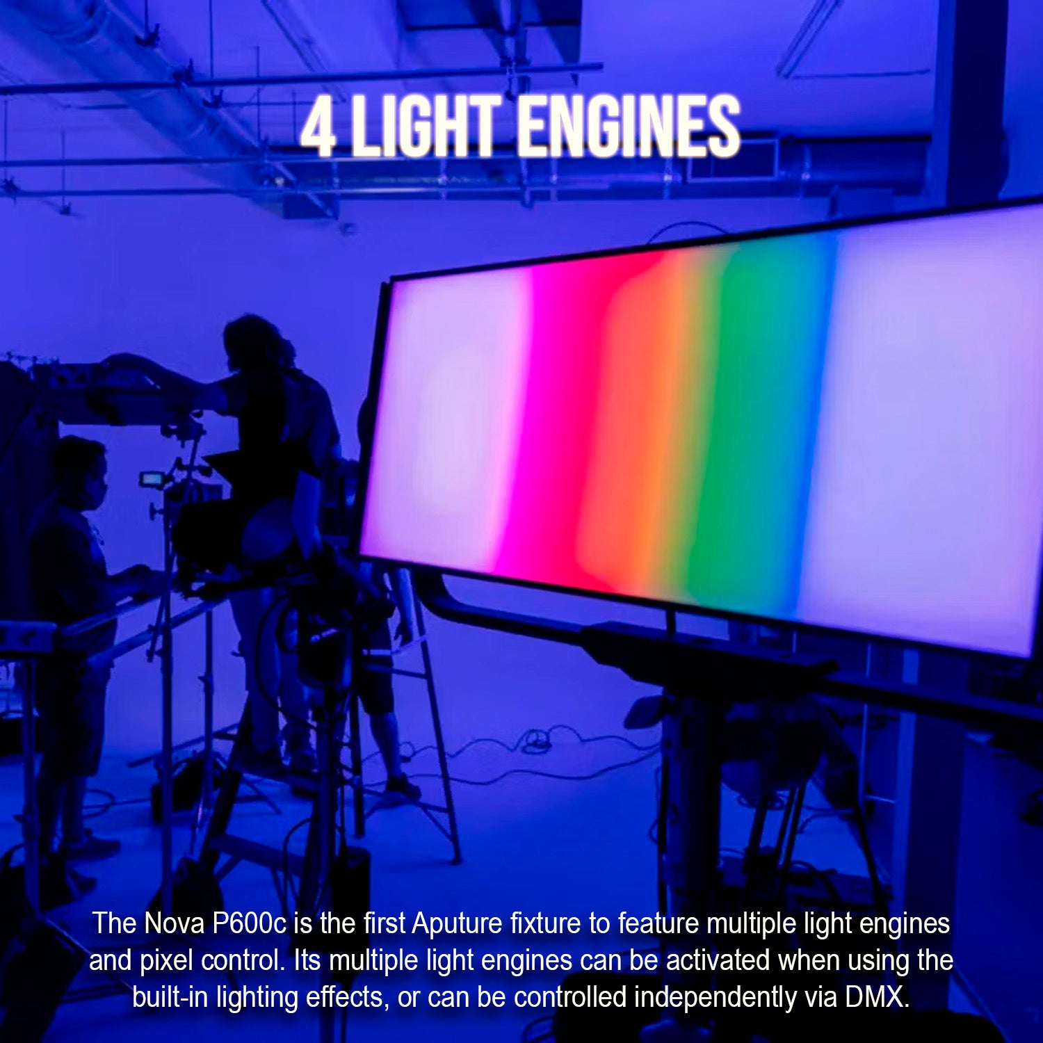 The Nova P600c is the first Aputure fixture to feature multiple light engines and pixel control. Its multiple light engines can be activated when using the built-in lighting effects or can be controlled independently via DMX.