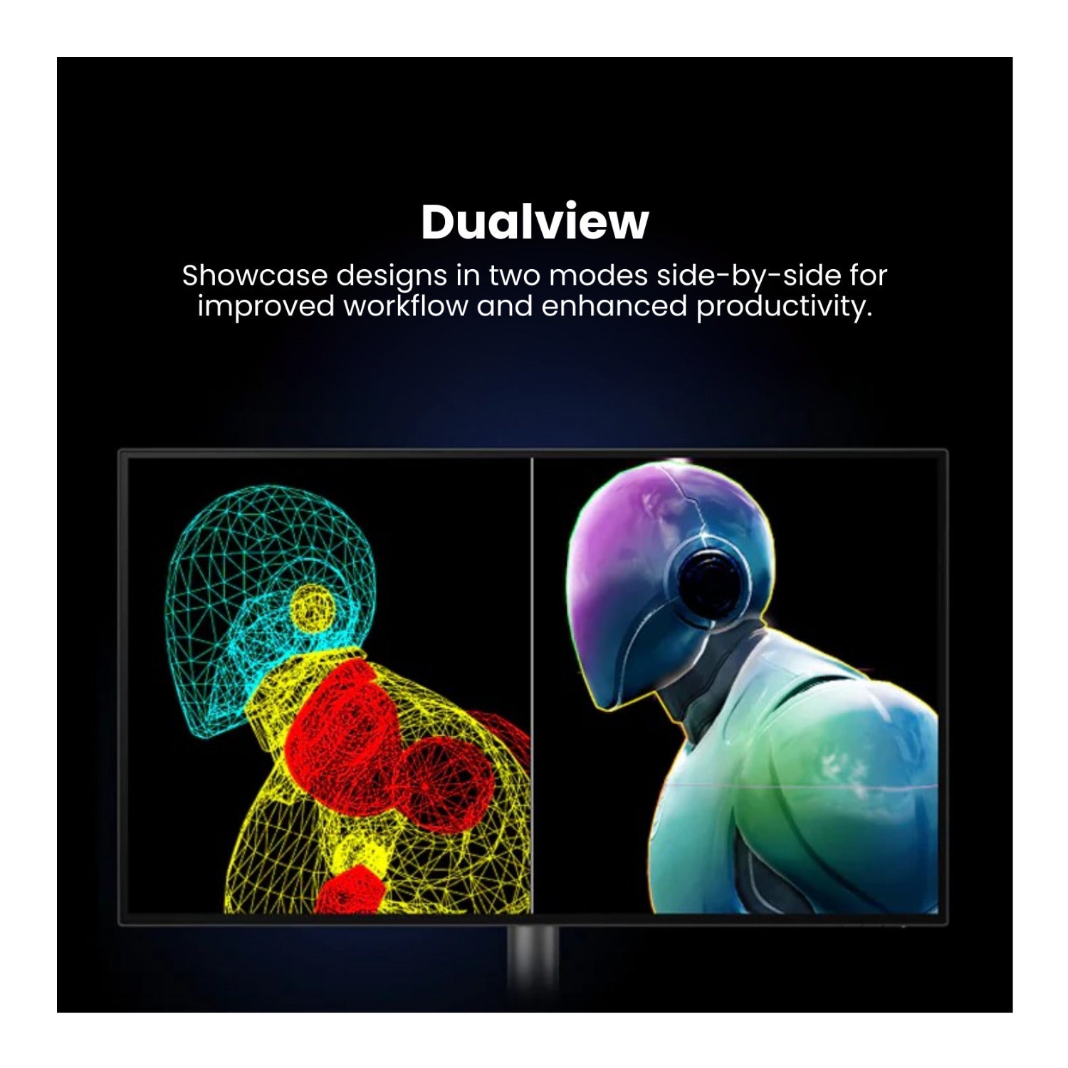 BenQ Display Pilot 2 enhances productivity with tools like Application Mode, Software Dimming, and ICCsync. Use CAD/CAM Mode for sharp technical illustrations, Animation Mode for enhanced dark area clarity, and DualView to compare designs side-by-side.