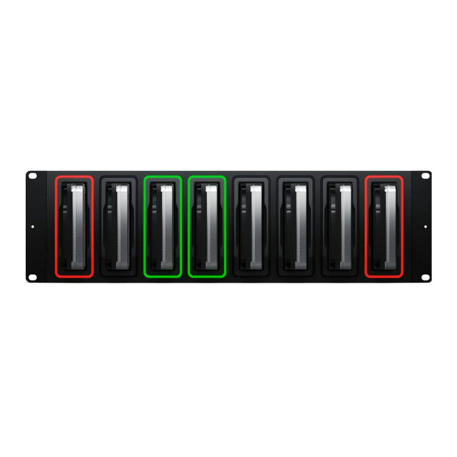 Blackmagic Cloud Backup 8 features a rack mount design, making it an ideal choice for installation in a studio alongside other network equipment or even for camera backups in a DIT cart on set. This ensures you always have a second backup to keep your camera files safe. You get 8 independent hard disk slots, with all disks available simultaneously over the network. Plus, there's a built-in 4 port 10G Ethernet switch for exceptionally high performance. There's also an HDMI output to watch a live graphic view of storage operations on a TV or monitor. Each slot is elegantly illuminated with a light ring that shows disk activity, allowing you to know when the disk is being read from or written to.