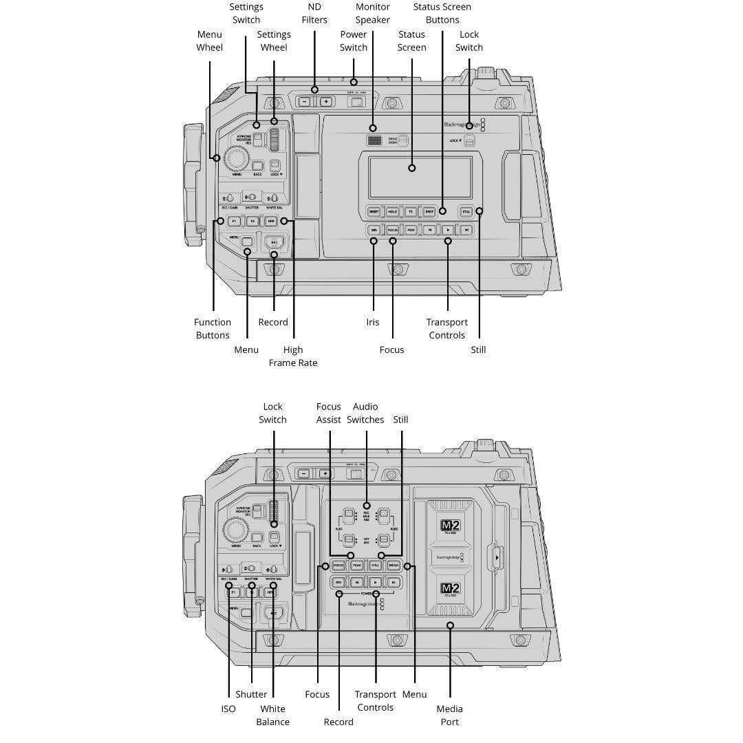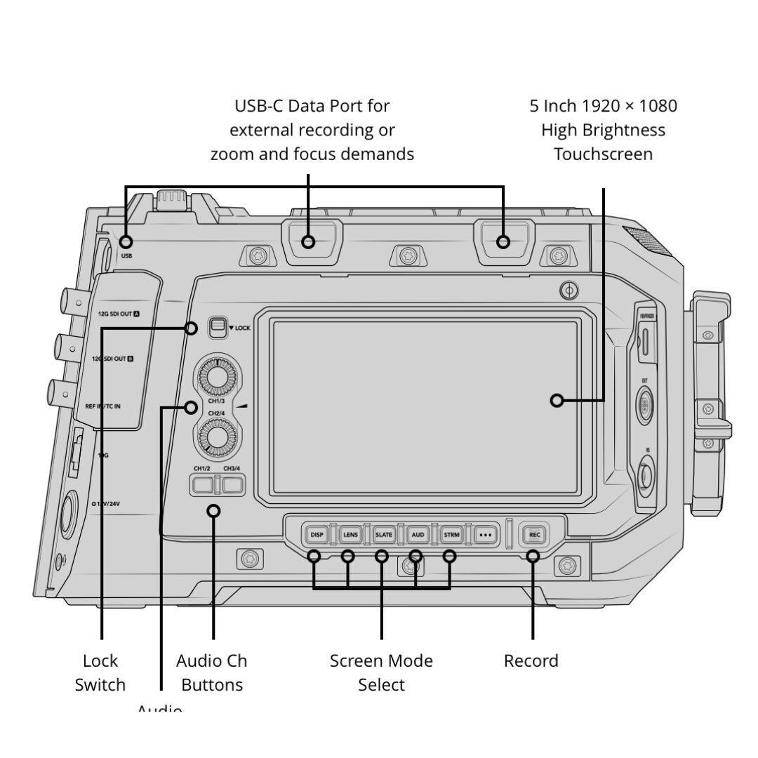 URSA Cine is designed to meet the demands of any high-end production. The evenly weighted camera body is built with a robust magnesium alloy chassis and lightweight carbon fiber polycarbonate composite skin to help you move quickly on set. Soft touch backlit buttons make controls easy to see in all conditions. There’s a 5-inch fold-out touchscreen for reviewing shots and accessing camera settings, plus a dedicated assist station on the other side of the camera, with a 5-inch LCD and full camera controls. Standard Lemo and Fischer connectors let you control the camera remotely while providing power for lens motors and other accessories. You also get 12G‑SDI out, 10G Ethernet, USB-C, XLR audio and more.