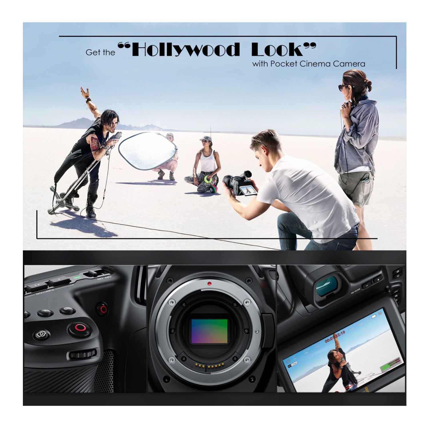 The elegant design of the Blackmagic Pocket Cinema Camera packs an incredible number of high-end digital film features into a miniaturized, handheld design. Made from lightweight carbon fiber polycarbonate composite, the camera features a multifunction handgrip with all controls for recording, ISO, WB, and shutter angle right at your fingertips. Because it's an advanced digital film camera, the sensor is designed to reduce thermal noise allowing cleaner shadows and higher ISO. Plus the large 5-inch LCD makes it possible to get perfect focus at 4K and 6K resolutions. You also get a removable battery door, 4 shockproof microphones, a heavy-duty lens mount, and a built-in speaker.