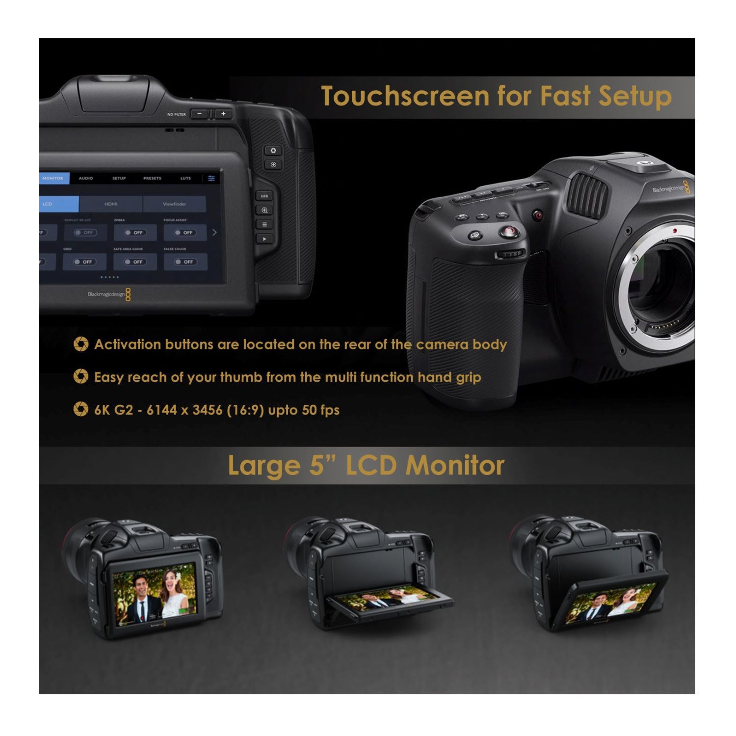The Blackmagic Pocket Cinema Camera 6K G2 is an advanced technology, handheld 6K digital film camera with 6144 x 3456 Super 35 high-resolution HDR sensor, dual native ISO, EF lens mount, and direct recording to USB-C disks! This powerful model adds an adjustable touchscreen, and a larger battery for longer run time. You can even add an optional OLED viewfinder.