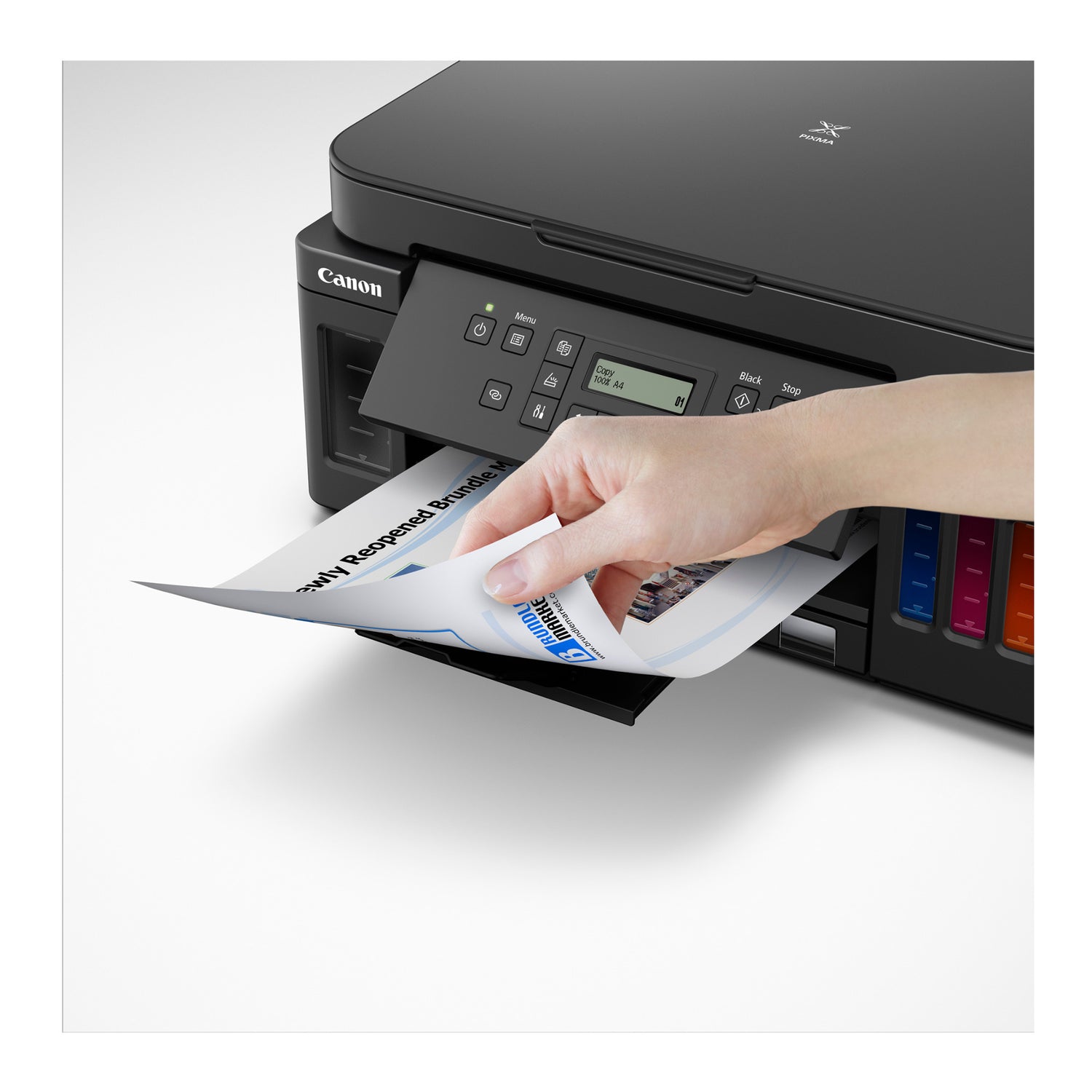 With a 350-sheet plain paper capacity, the PIXMA G6020 is ready to take on large print jobs. Better yet? You won’t have to worry about running out of ink — the included ink set can print thousands of black-and-white or full-color pages per ink bottle set, helping you lower costs, boost uptime and enjoy an uninterrupted flow of documents and photos.