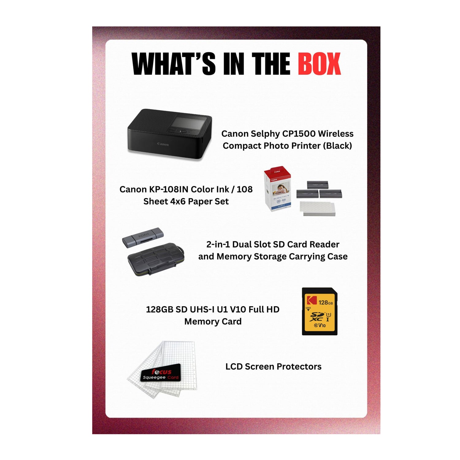 Canon Selphy CP1500 Wireless Photo Printer (Black) with Accessories Bundle