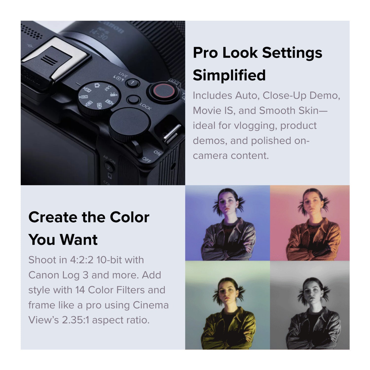 Advanced creators will appreciate features like Canon Log 3, HLG, PQ, and Canon709 recording with 4:2:2 10-bit color for professional-quality video. A new Color Filter mode adds 14 unique color options, while the new Cinema View mode enables instant 2.35:1 letterboxed cinematic framing.