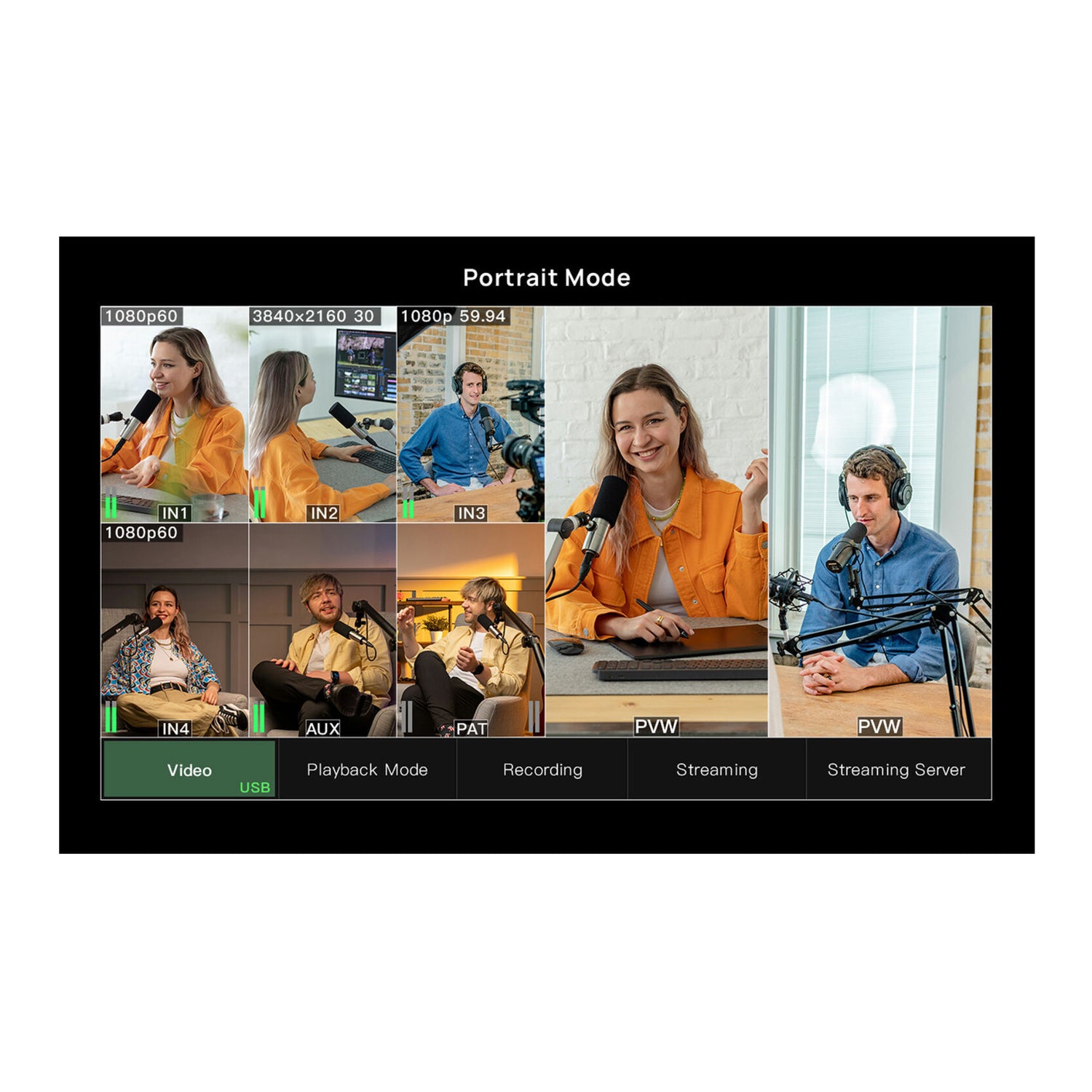 A USB-A port for UVC connectivity allows the switcher to operate in webcam mode, sending video and audio to a computer for live broadcasts to a variety of platforms, including OBS, vMix, Teams, Twitch, YouTube, Skype, VLC, and more. The integrated stream engine enables live streaming to two destinations simultaneously via an Ethernet connection without needing to connect to a computer.