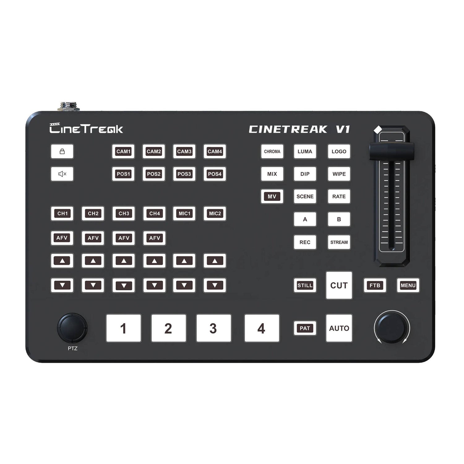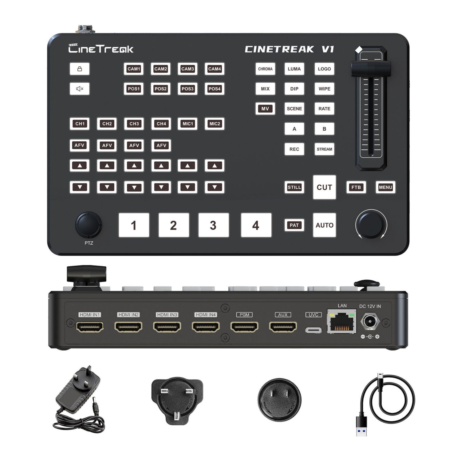 The CineTreak V1 4-Channel HDMI Video Switcher lets you stream and mix video in both horizontal and vertical orientations. It supports four 1080p60 HDMI inputs with embedded audio, plus HDMI program/preview outputs, LAN, USB-C UVC output, and USB-A recording.