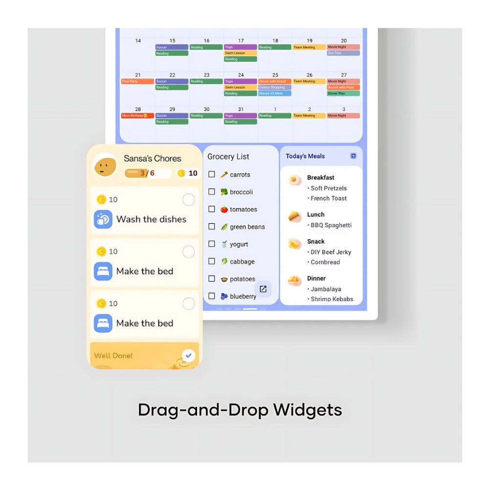 Create multiple custom dashboards to fit your family’s unique needs. Choose from widgets like chore charts, calendars, checklists, clocks, and weather updates. Personalize the background and layout to match your family’s style.
