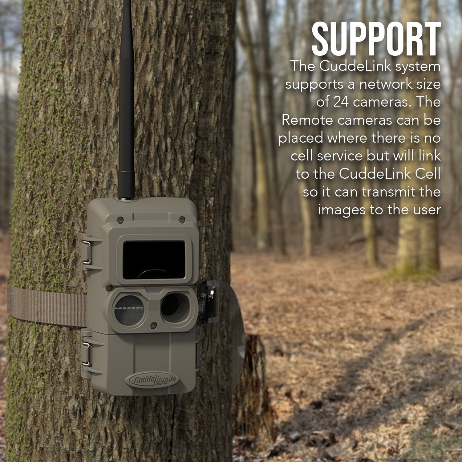 The CuddeLink system supports a network size of 24 cameras. The Remote cameras can be placed where there is no cell service, but will link to the CuddeLink Cell so it can transmit the images to the user.