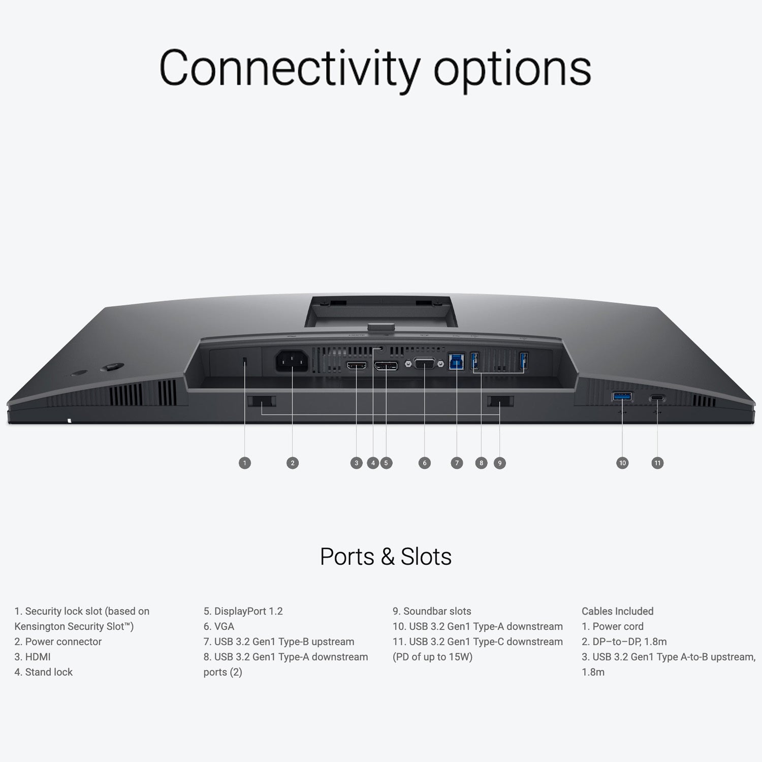 The Dell P2425H 24-inch LED Monitor offers extensive connectivity with various ports, including quick-access USB ports and a USB-C downstream delivering up to 15W of power. It is also compatible with VESA mounts and soundbars for flexible mounting options.