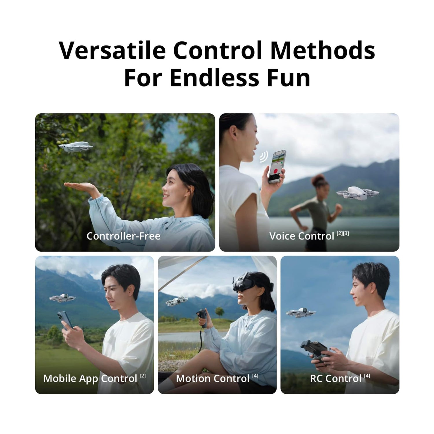 The DJI Neo drone allows controller-free aerial filming. However, it can be paired with DJI Fly app, remote controllers, RC Motion, DJI Goggles, and more for a more seamless user control experience. Equipped with Voice Command control, simply say ‘Hey Fly’ to get the DJI Fly App working for the DJI Neo using spoken flight directives. With the DJI Fly app, you can also control the drone up to 50 meters using a joystick. To get a hold over its control up to a range of 10 kilometers, pair it with the DJI RC-N3 remote controller. You can also use traditional RC control sticks to capture brilliant shots. To enjoy an immersive experience while flying up to 10 kilometers, pair the DJI Neo with DJI Goggles 3, RC Motion 3, or FPV Remote Controller 3. Paired with the Motion 3, Neo navigates through compact spaces easily.
