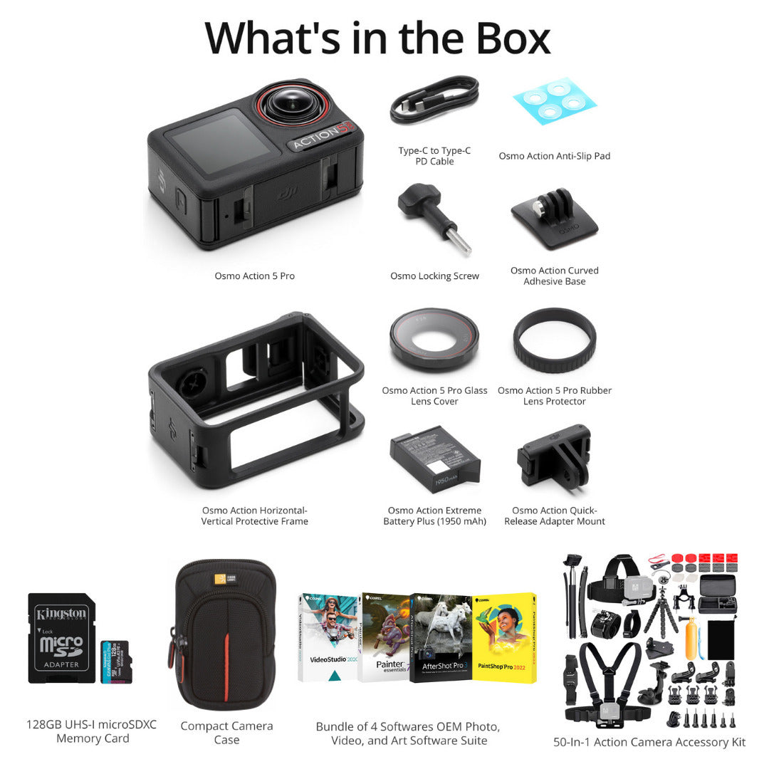 DJI Osmo Action 5 Pro Adventure Combo with 4 Photo Softwares, 50-in-1 Accessory Set Bundle