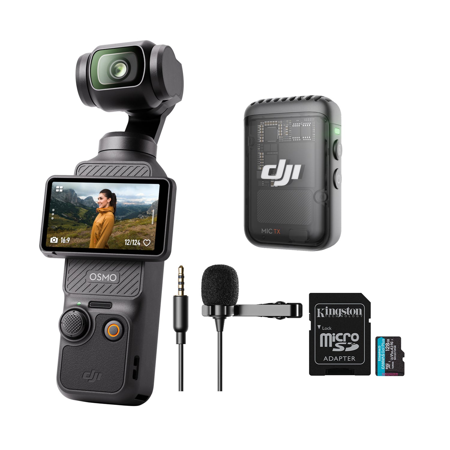 DJI Osmo Pocket 3 with Mic 2 (1 TX, Shadow Black), Lav Mic, and 128GB MicroSD Card bundle