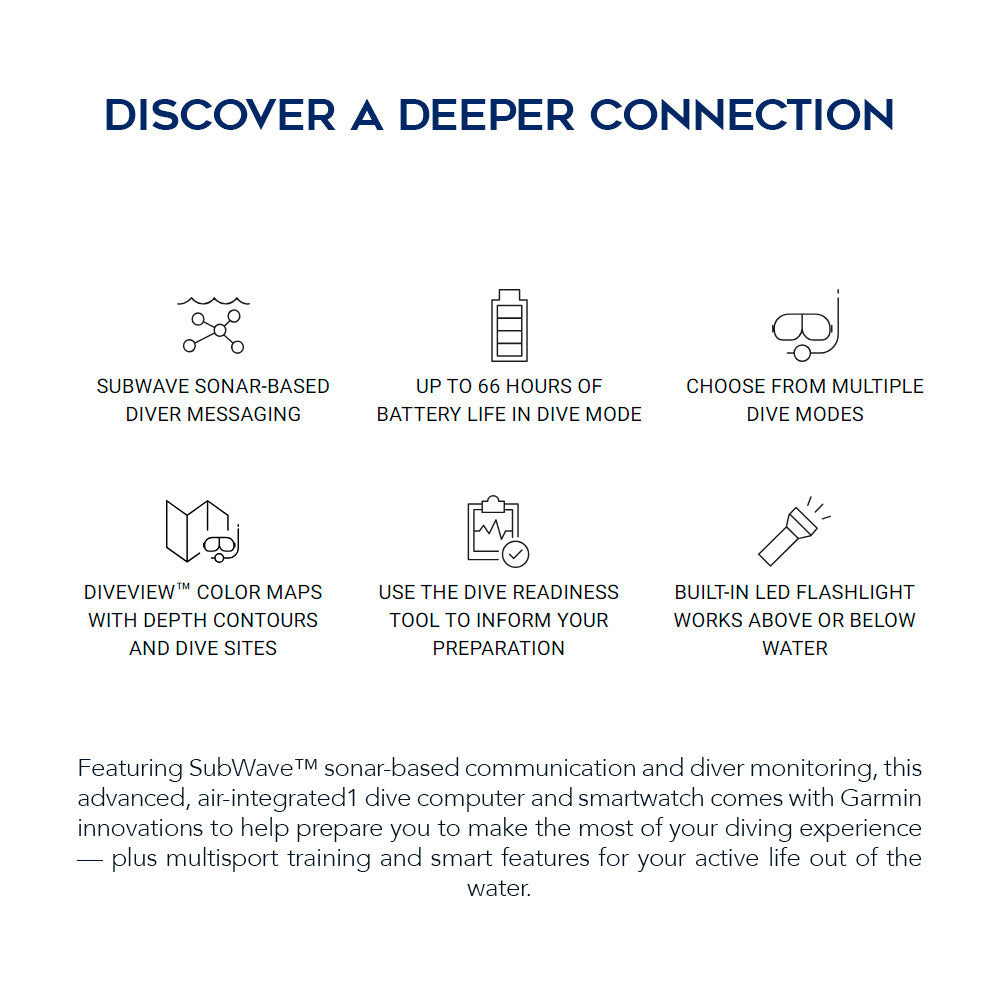 Featuring SubWave sonar-based communication and diver monitoring, this advanced, air-integrated Garmin Dive Computer and Smartwatch comes with Garmin innovations to help prepare you to make the most of your diving experience plus multisport training and smart features for your active life out of the water.
