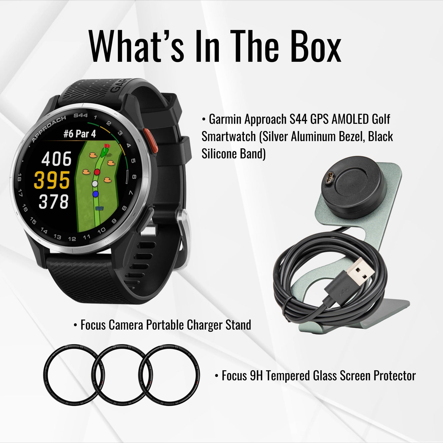 Garmin Approach S44 GPS AMOLED Golf Smartwatch (Silver Aluminum Bezel, Black Silicone Band) Bundle