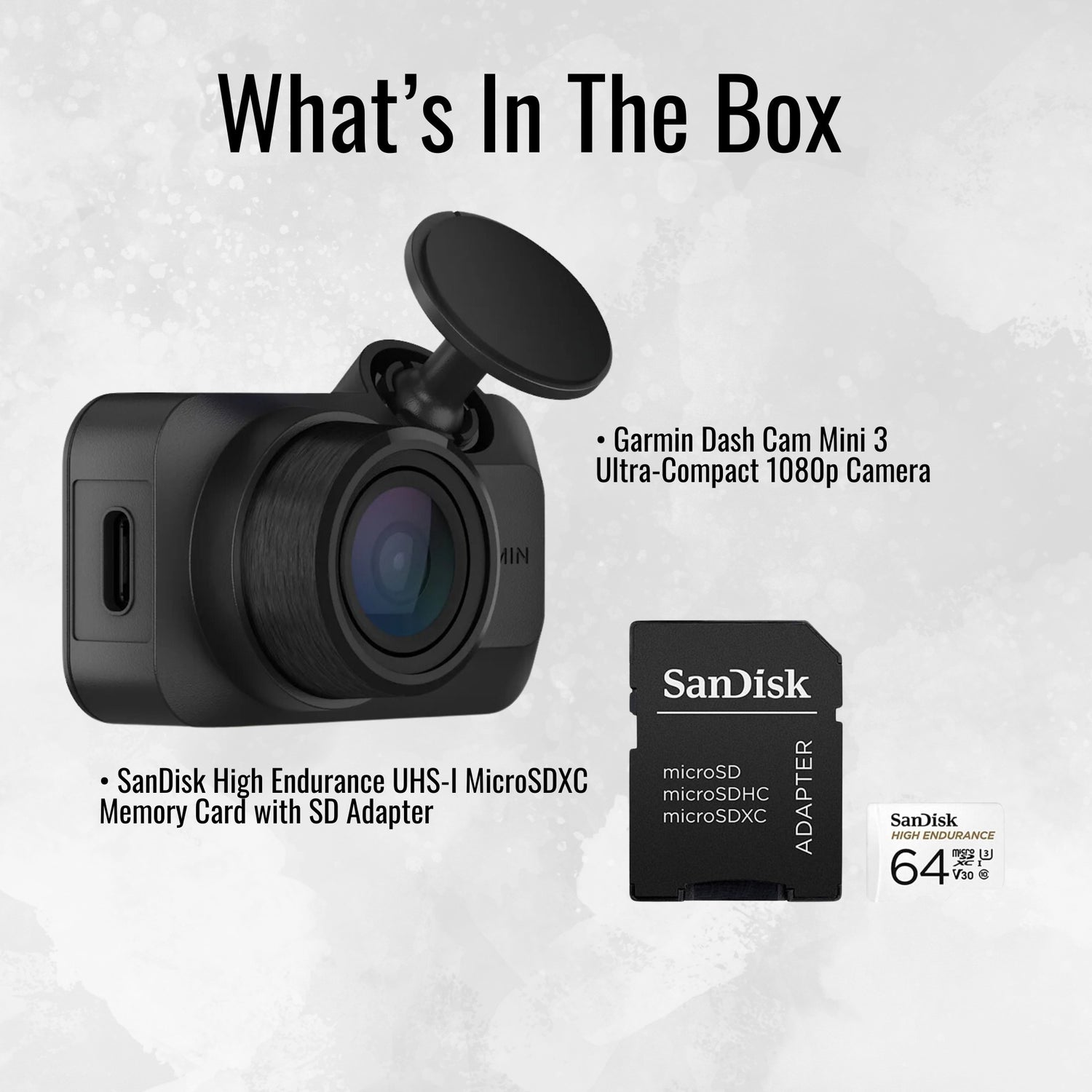 Garmin Dash Cam Mini 3 Ultra-Compact 1080p Camera (Black) with 64GB MicroSDXC Memory Card Bundle