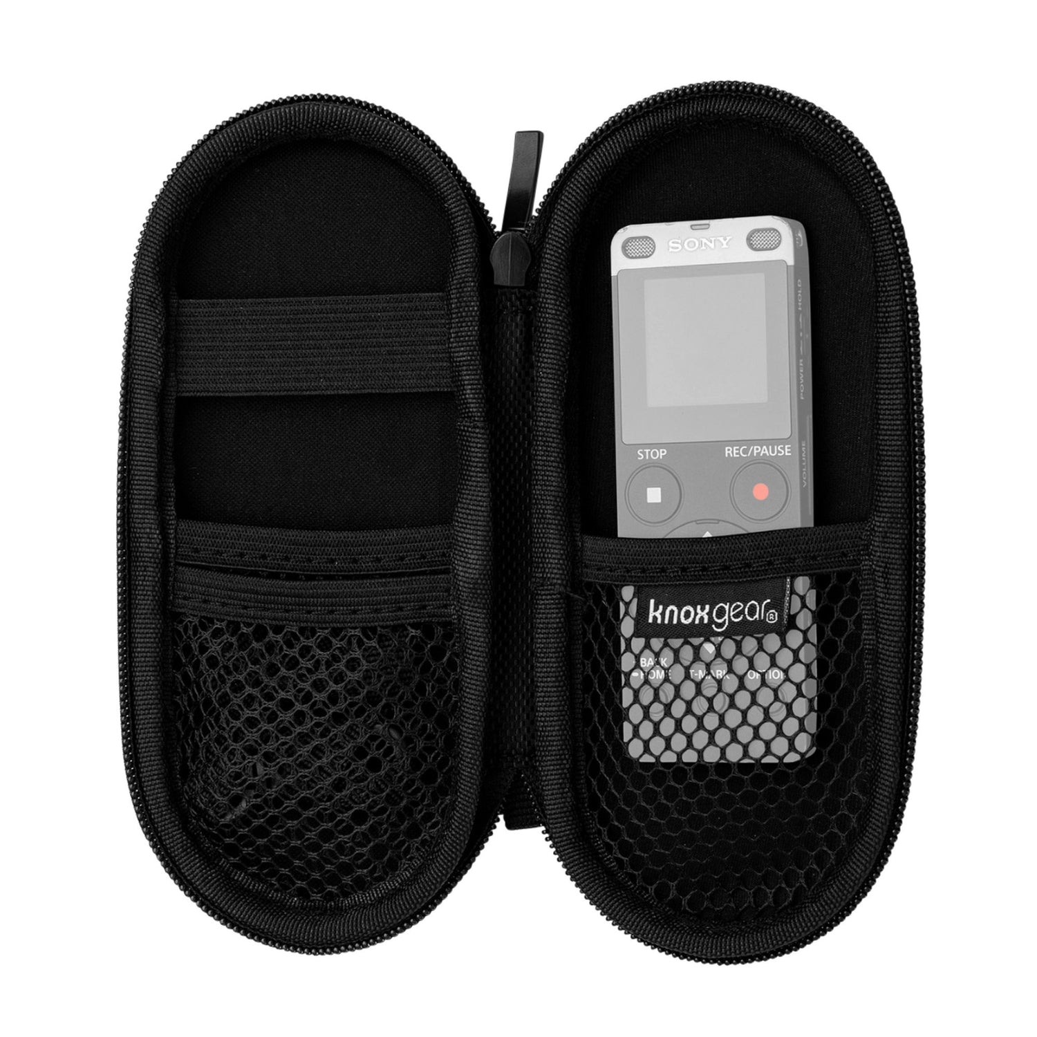 This durable hardshell case is designed for Sony audio recorders and other brands like Olympus, Zoom, iZotope, and Tascam. Made of high-quality EVA material, it offers solid protection against water, dust, shocks, and impacts while keeping your device scratch-free with its soft inner lining. The case includes two elastic bands and three mesh pockets for securely storing recorders, cables, and accessories. Its compact, lightweight design with a wrist strap makes it easy to carry in a bag or by hand, perfect for travel, lectures, interviews, or creative recording sessions.