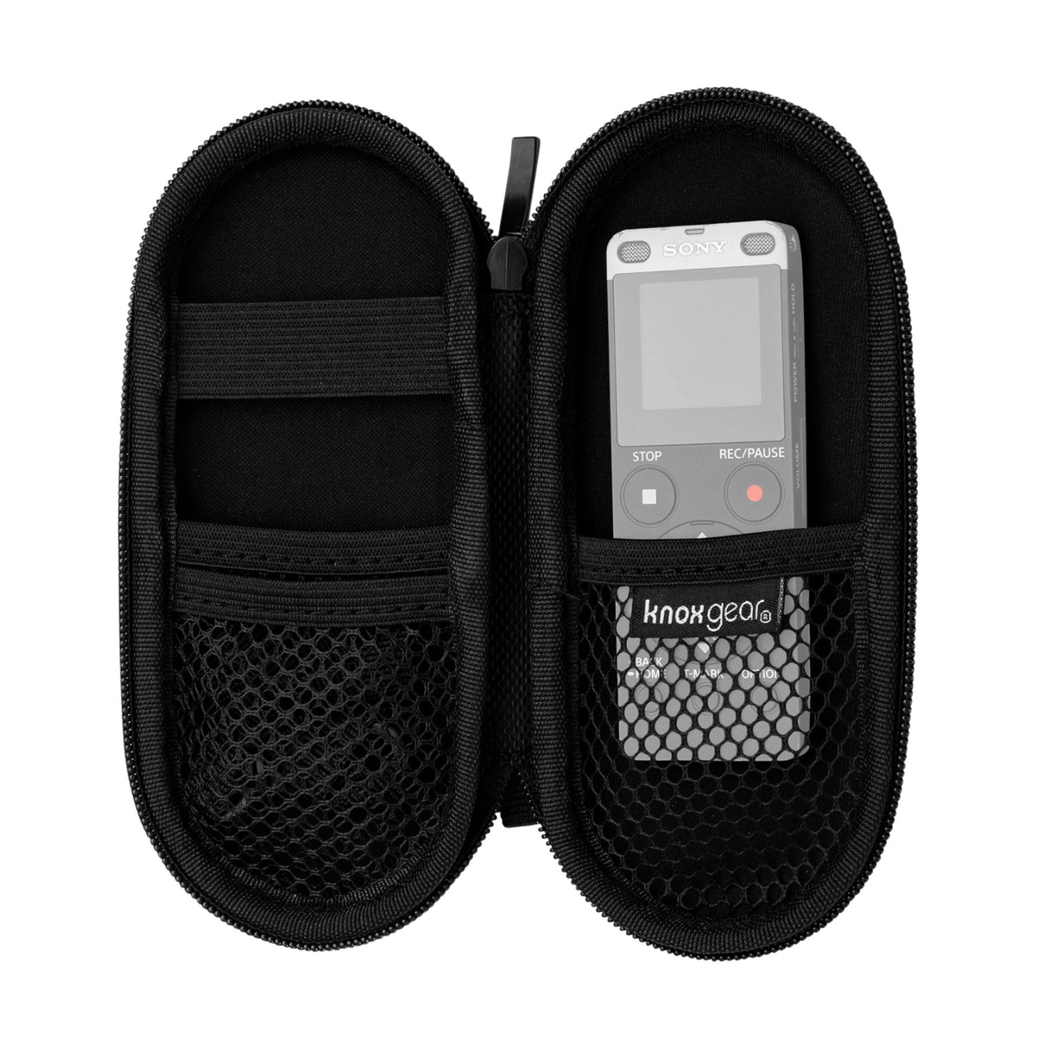 This durable hardshell case is designed for Sony audio recorders and other brands like Olympus, Zoom, iZotope, and Tascam. Made of high-quality EVA material, it offers solid protection against water, dust, shocks, and impacts while keeping your device scratch-free with its soft inner lining. The case includes two elastic bands and three mesh pockets for securely storing recorders, cables, and accessories. Its compact, lightweight design with a wrist strap makes it easy to carry in a bag or by hand, perfect for travel, lectures, interviews, or creative recording sessions.