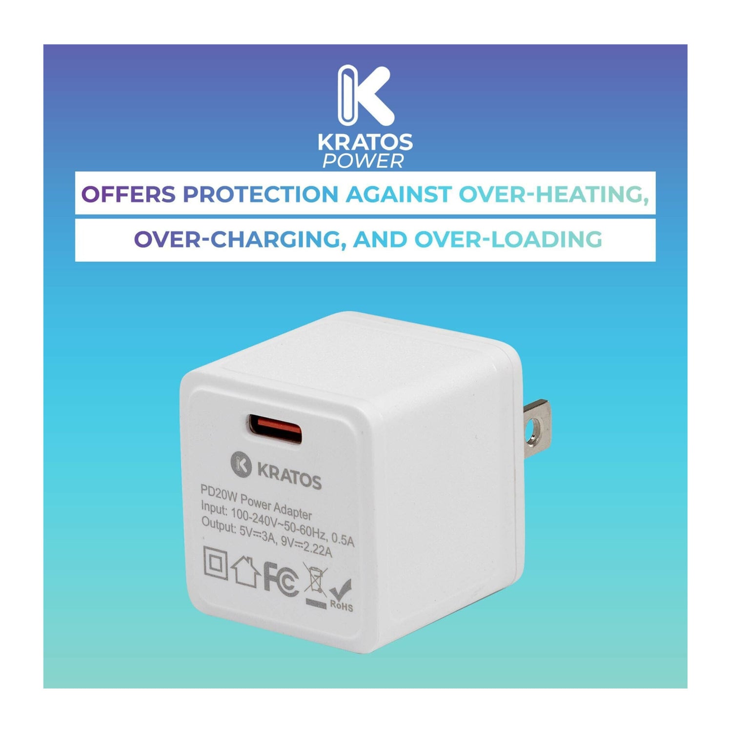 Experience next-gen charging speeds with the Kratos Power 20W USB-C Wall Charger, featuring USB-PD technology for up to 3x faster charging than standard 5W adapters. Designed for efficiency and safety, it supports PD-enabled devices, MagSafe 15W connections, and popular models like iPhone 12, iPad Pro, and Google Pixel 5. The compact, low-profile design fits any standard outlet without blocking others, making it perfect for home, office, or travel use. Built with advanced protection against overheating, overcharging, and overload, this fireproof and RoHS-certified adapter includes an intelligent chip for optimized charging and a 1-year limited warranty.