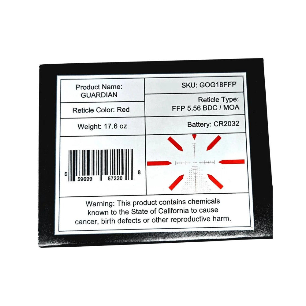 The Guardian 1-8X FFP LPVO is a versatile, lightweight optic built for hunting, self‑defense, competition, and ranch or patrol use. Its 1–8× magnification, 24 mm objective, and wide 2.8–22.0 degrees field of view (14.8–116.6 ft at 100 yards) deliver fast target acquisition at close range and precise shots at distance. An etched-glass first focal plane BDC/MOA reticle keeps reference points accurate at every magnification, while 3.5 inches of eye relief and a slim 30 mm tube make mounting and comfortable shooting simple.