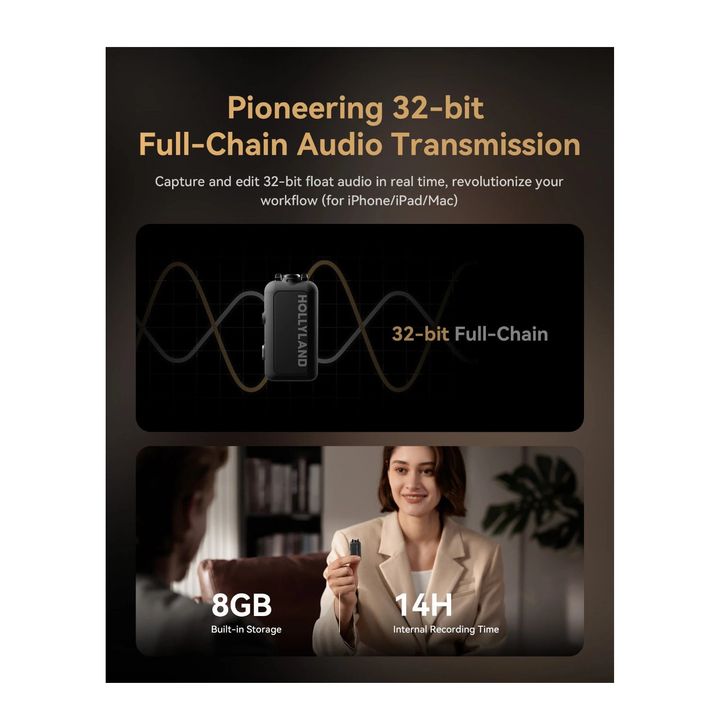 Each transmitter features 8GB of built-in storage, capable of recording up to 14 hours of uncompressed high-quality audio. This serves as a secure backup, ensuring no precious audio is ever lost. Additionally, the transmitter can function as a standalone voice recorder, capturing audio directly to the device independently of your camera or smartphone, providing dual assurance for on-site recording.