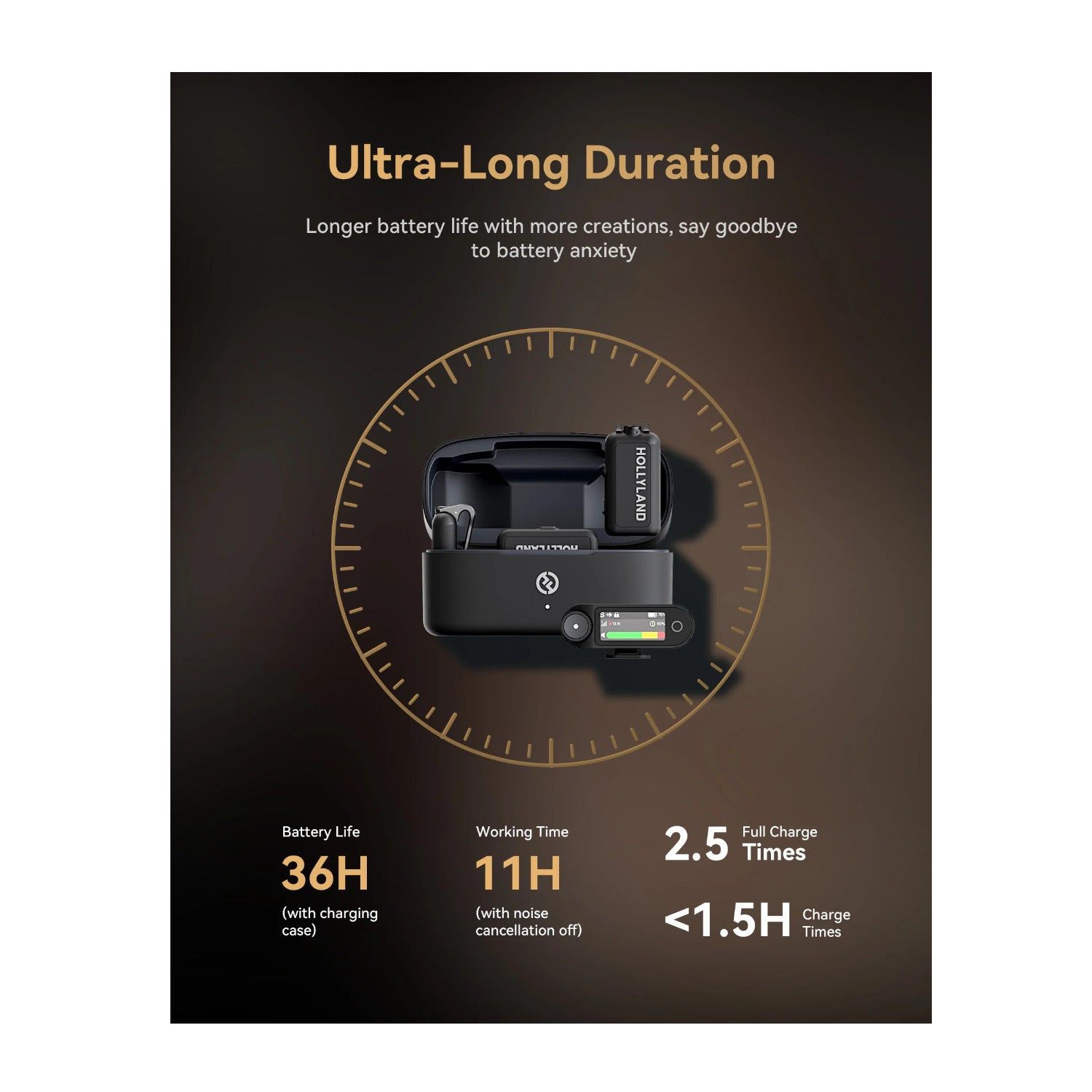Each transmitter delivers at least 11 hours of working time (noise cancellation off), extendable to an impressive 36 hours with the charging case, say goodbye to battery anxiety! Additionally, when connected to a smartphone, the receiver's USB-C port can connect to a charging cable to charge the phone.