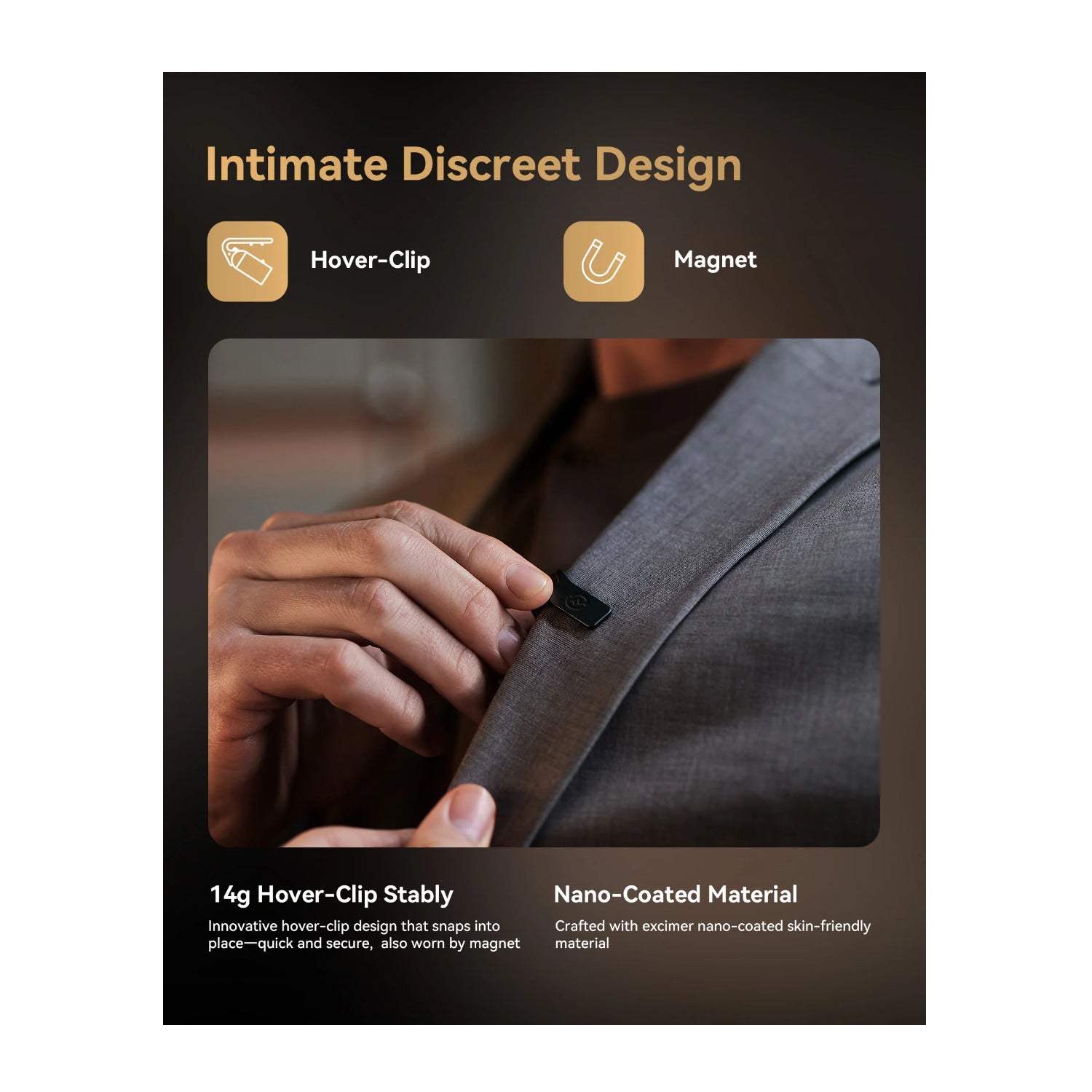 Crafted with excimer nano-coated skin-friendly material, our microphone provides delicate tactile and offers exceptional comfort throughout the day.