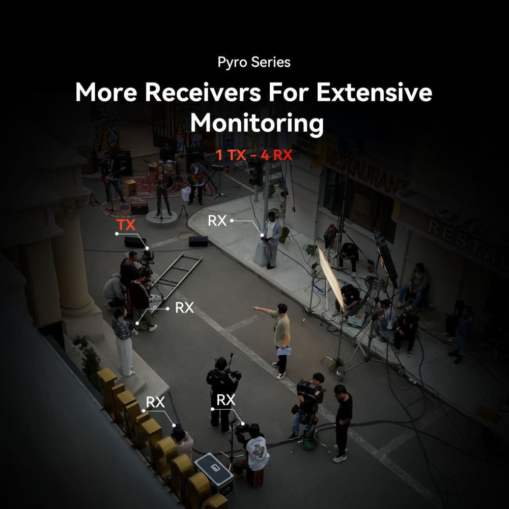 Using 2.4 GHz and 5 GHz Dual-Band tech, Pyro H ensures stable transmission up to 1,300ft with latency as low as 60ms. Two user-selectable modes, HD and Smooth let you balance image quality and latency.