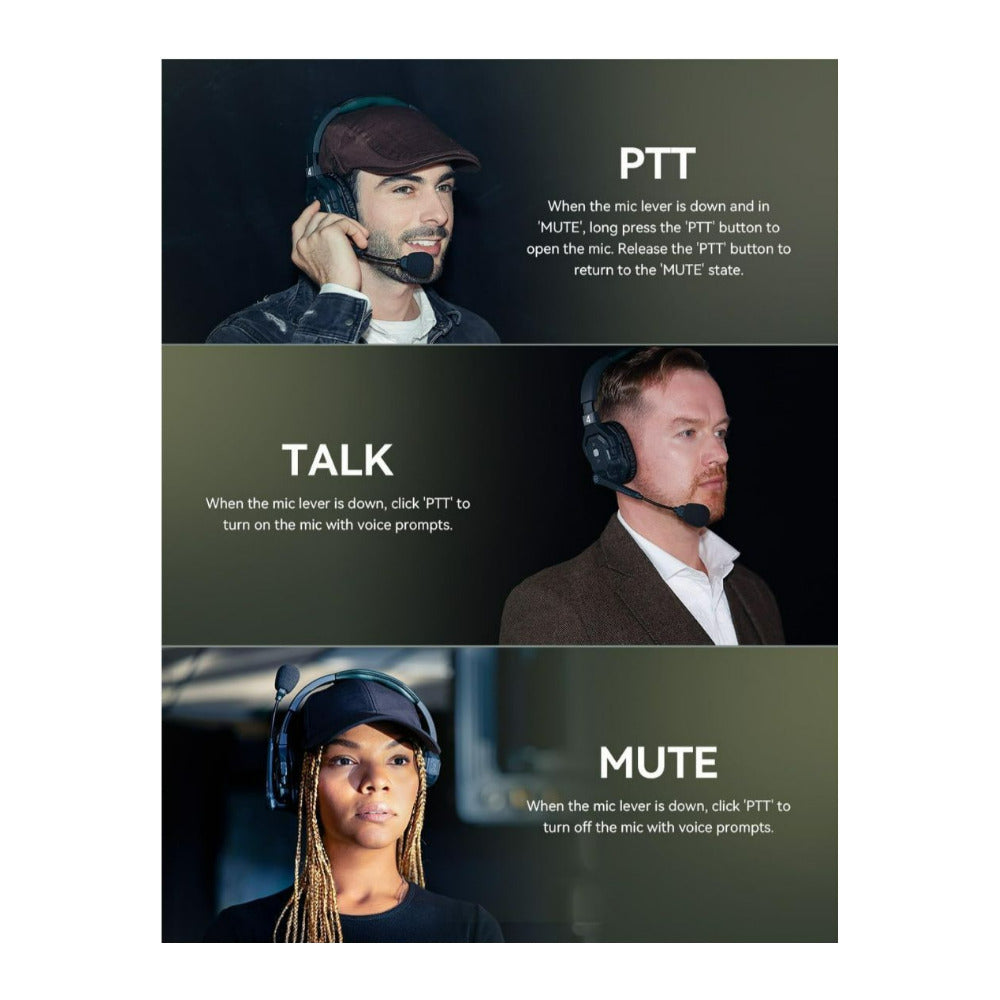 The Solidcom SE Pro 2S is pre-paired and ready to use - just unbox and start filming. Simply pull down the boom mic to begin communicating. Designed for immediate use, it features a green headband for a subtle, professional look. A dedicated Mute button and boom mic mute provide easy switching between Talk and Mute, while the industry-standard PTT mode ensures seamless communication tailored to your needs.