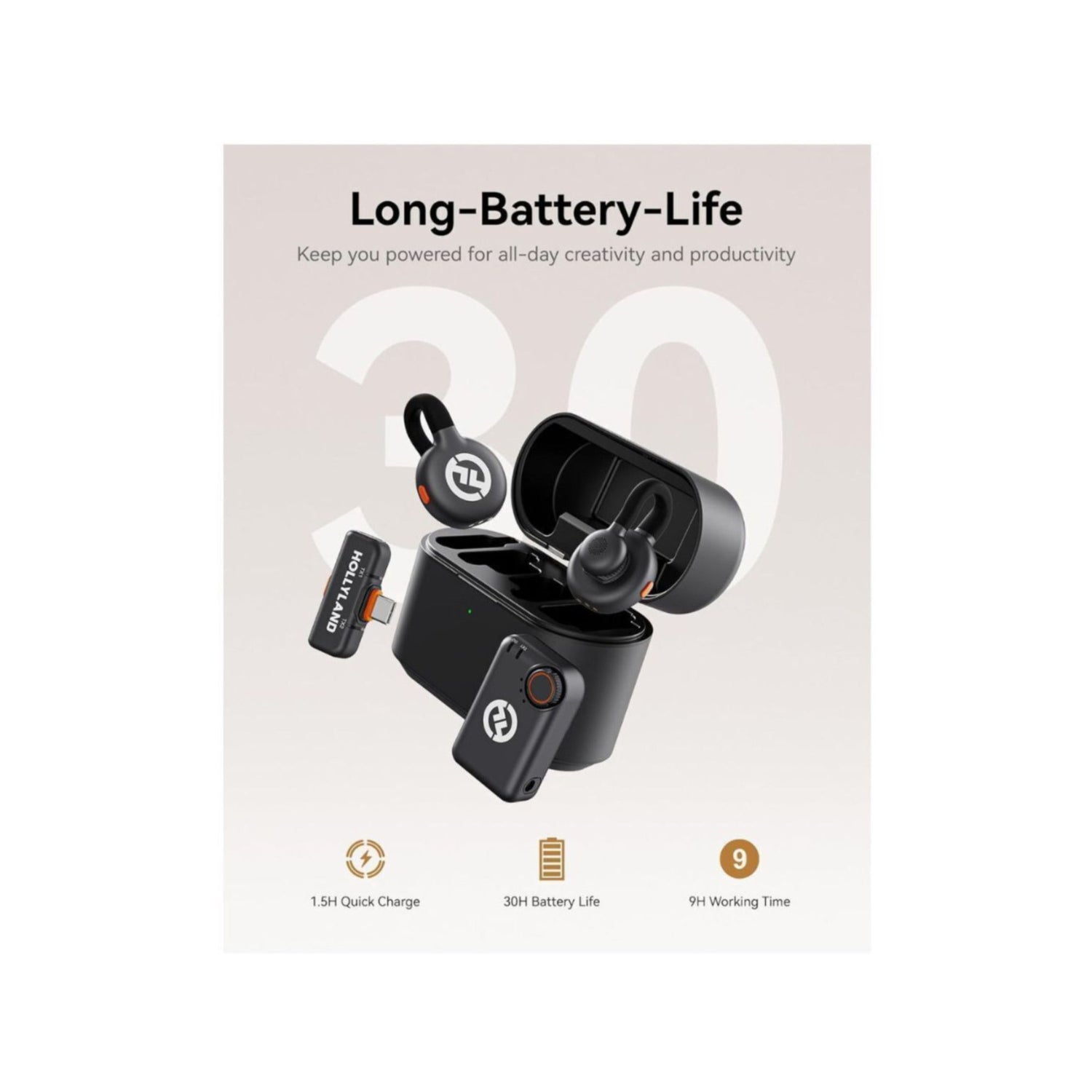 Enjoy 9 hours of operating time per transmitter and receiver (without noise cancellation) and recharge in just 1.5 hours. The charging case provides an additional 2.5 full charges, giving you a total of up to 30 hours of battery life (27 hours for Lark M2 Mobile Version) to support your creativity and productivity throughout the day.