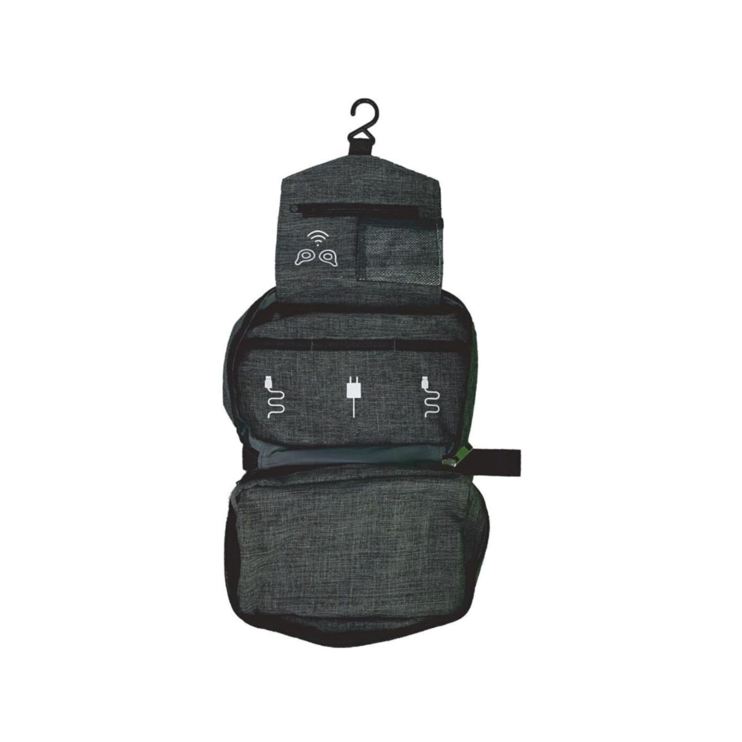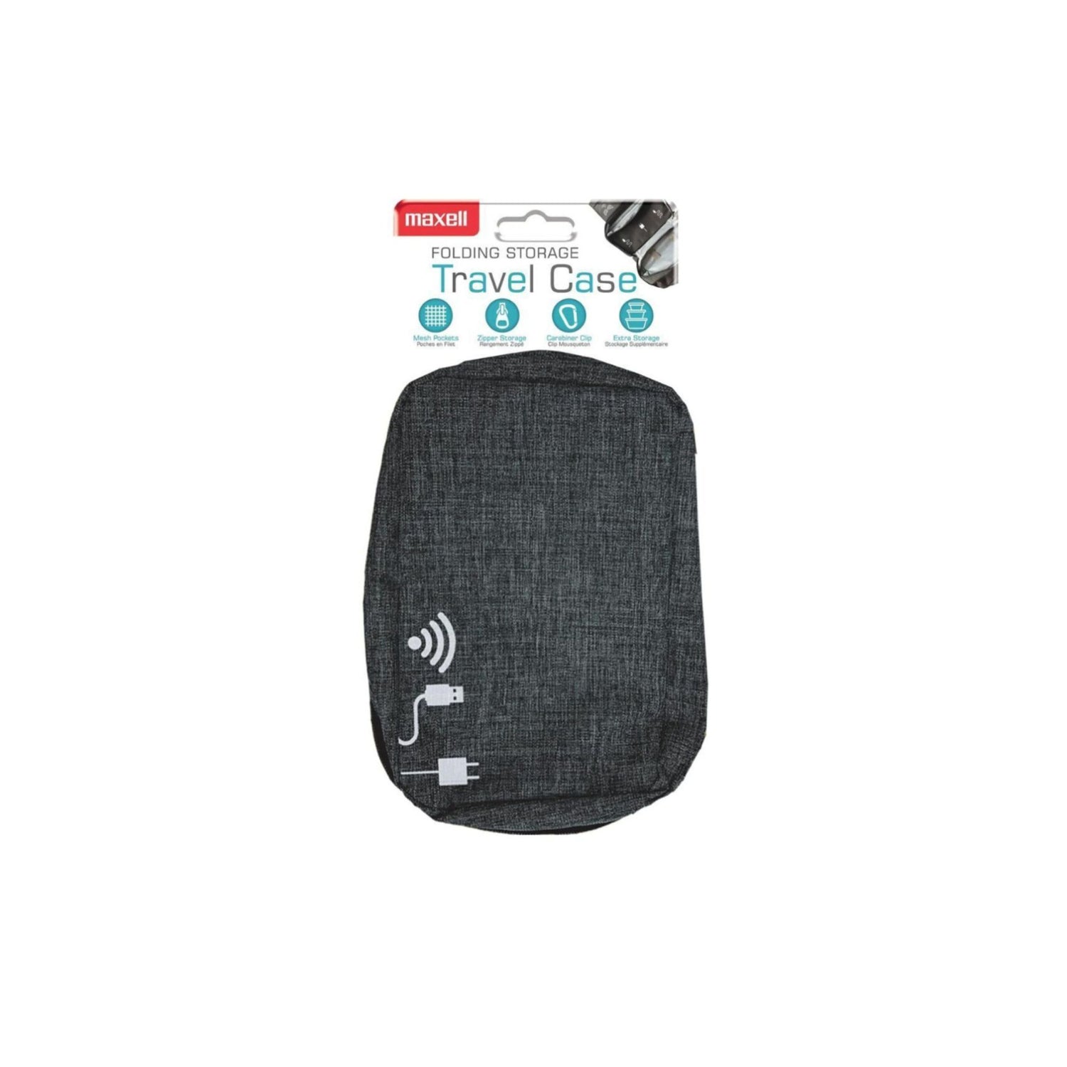 The Maxell Folding Storage Travel Case in Black is ideal for traveling, whether for business or pleasure. The practical, space-saving design allows for a multitude of storage options. The included pouches and pockets can hold a multitude of cables, earbuds, or accessories, and once closed, the exterior will protect your belongings from damage. The folding design allows this case to fit into most luggage and backpacks, and when unfolded, it can be hung up thanks to the included hook. It features 2 zippered pouches to handle larger accessories, a mesh pouch for TW earbuds, a small, zippered pocket for credit cards, and 3 pouches to store cables and adapters. The carabiner clip helps you attach it to a bag, backpack, or wall hook.