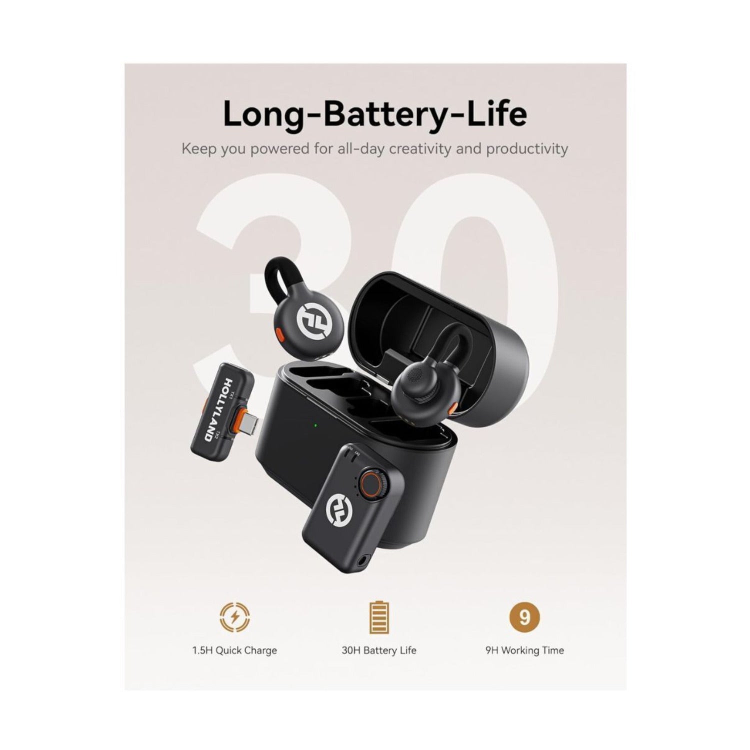 Get 9 hours of use per mic and receiver, plus 2.5 extra charges from the case, for up to 30 hours total. Full recharge takes only 1.5 hours.