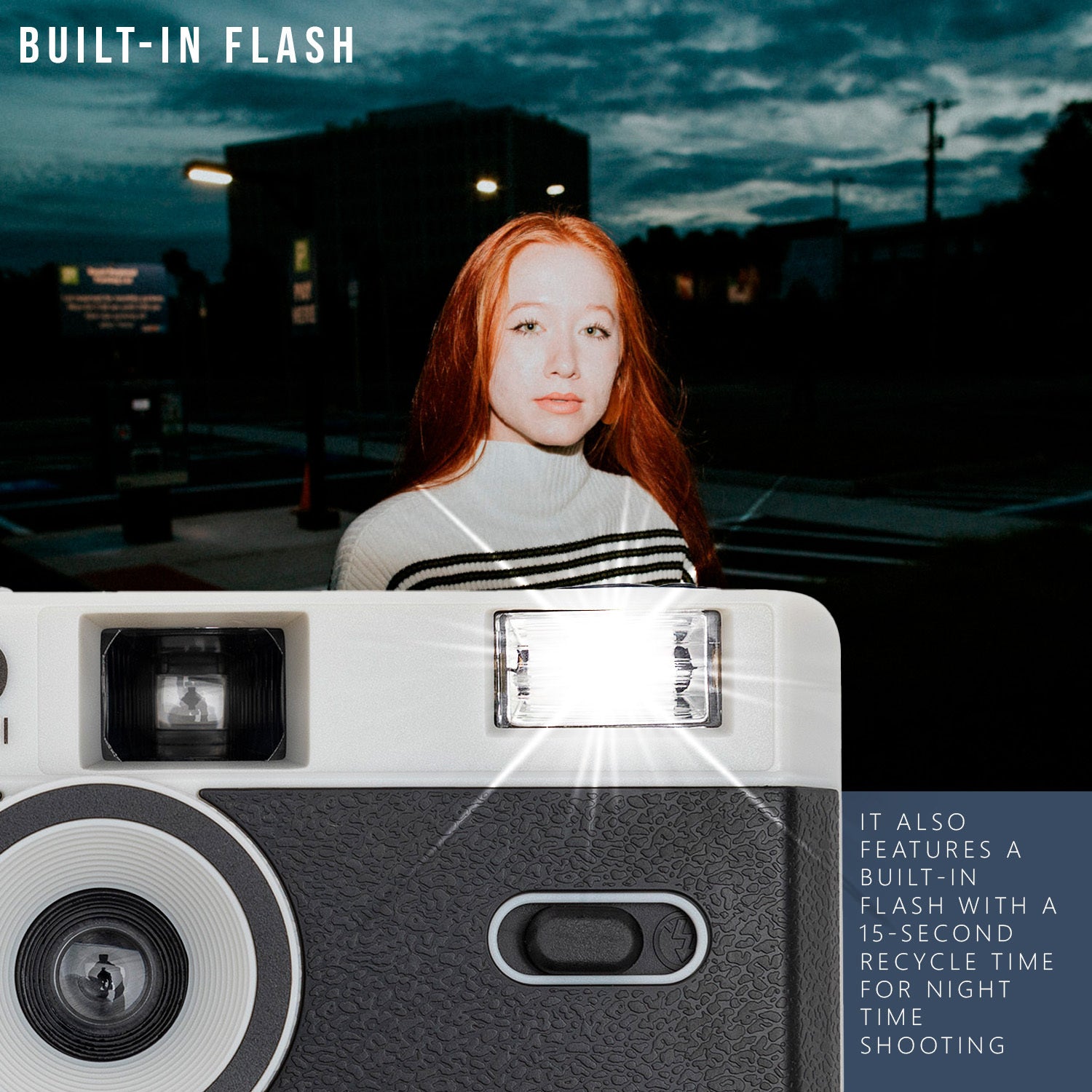 The camera has a fixed shutter speed (1/120s) with a 31mm, single element f/9 fixed-focus wide-angle lens, perfect for capturing most well-focused daylight scenes, and also features a built-in flash with a 15-second recycle time for night time shooting.