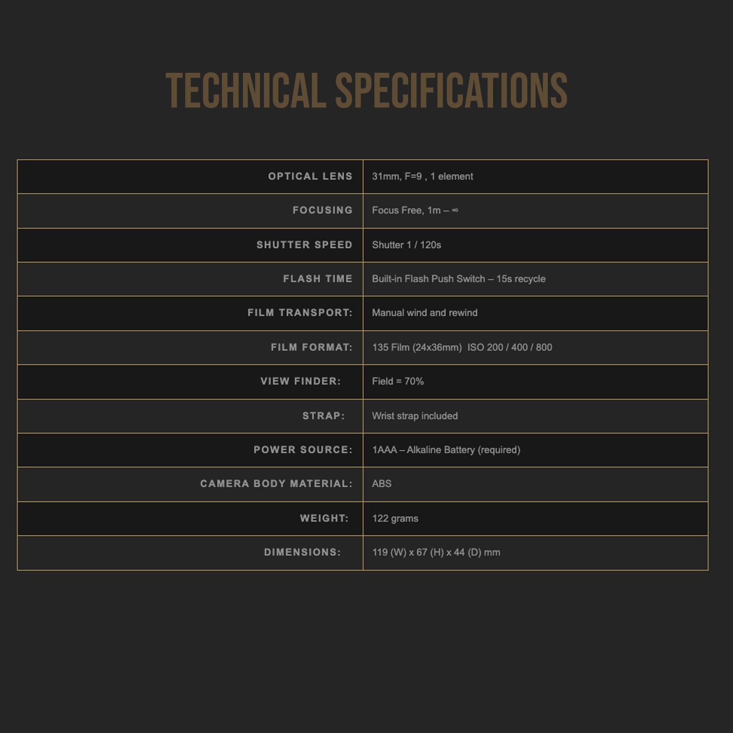 The camera has a fixed shutter speed (1/120s) with a 31mm, single element f/9 fixed-focus wide-angle lens, perfect for capturing most well-focused daylight scenes, and also features a built-in flash with a 15-second recycle time for night time shooting.