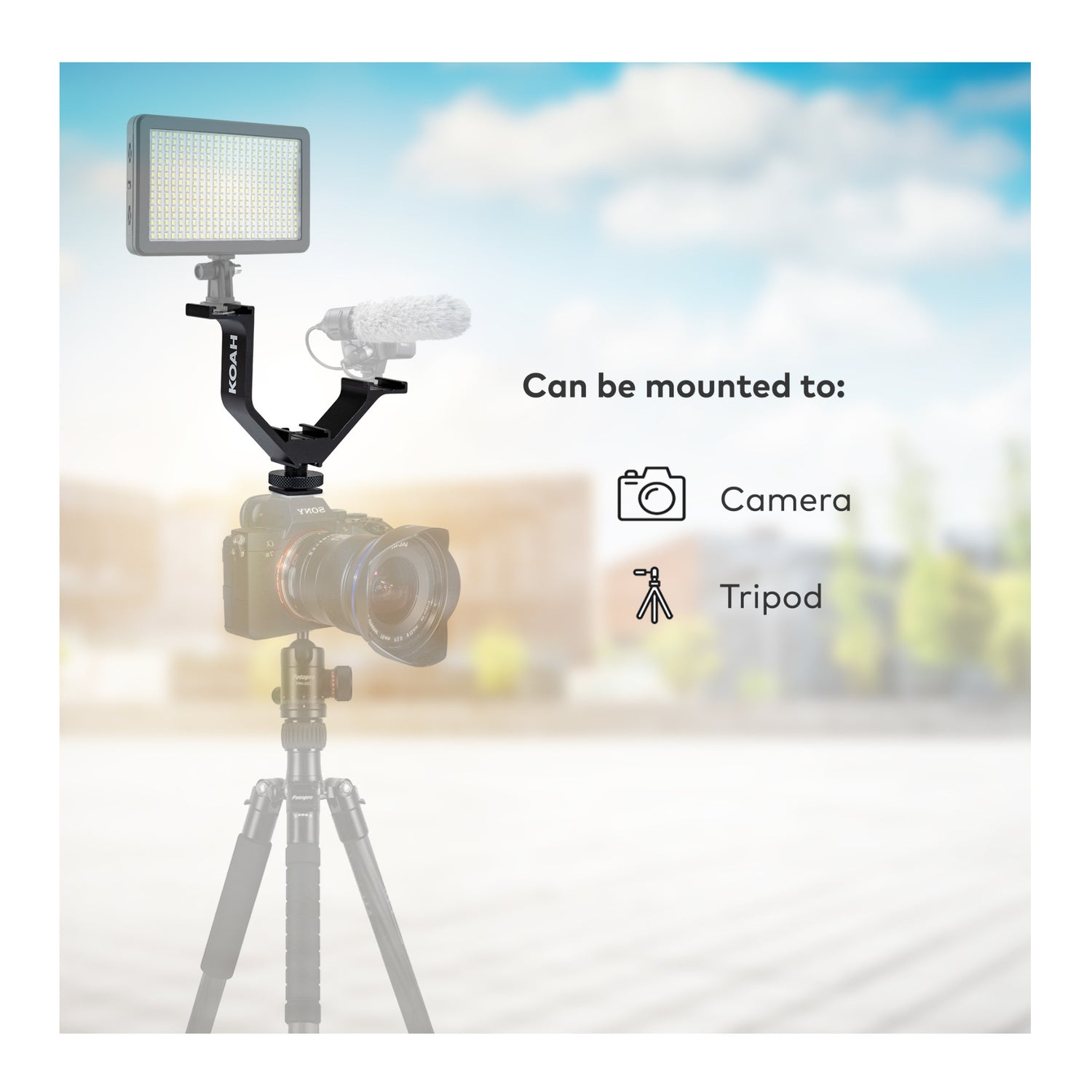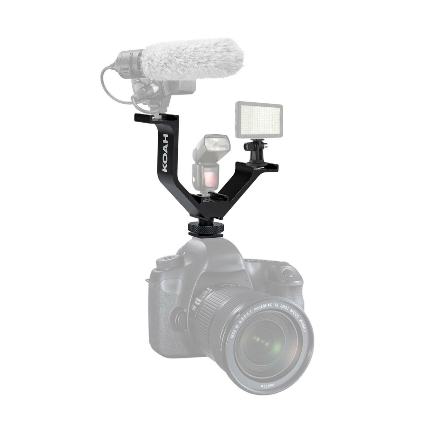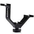 Koah Triple Camera Mount Shoe Bracket provides mounting to your DSLR accessories and is a must-have camera tripod mount. The DSLR camera mount makes your video-making experience seamless as it can be used as a microphone mount, monitor mount, or off-camera flash mount at the same time. The lightweight mount is made out of a single-piece aluminum alloy to offer additional strength; moreover, the built-in backstops provide secure mounting to the attached accessories of DSLR. The bottom shoe that mounts onto the camera features a locking pin, which prevents the bracket from rotating. The bracket can attach directly to a camera via the accessory shoe or, additionally, it features a 1/4-inch-20 socket for attaching to threaded mounts such as a tripod. Comes with a limited 1-year warranty. The Koah 4.1-inch Triple Shoe Bracket easily mounts on a camera's accessory shoe mount, giving you three additional accessory shoe mounts. This is great for mounting, lights, microphones, monitors, and a variety of other accessories. This triple cold shoe bracket easily gives you the ability to do what you can't with a single hot shoe mount on your camera. In addition to the shoe mount, a 1/4-inch-20 thread is also available for attaching the bracket to a tripod, or other bracket featuring a 1/4-inch-20-threaded mount.