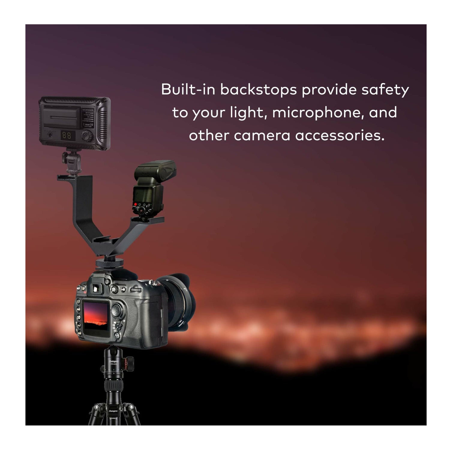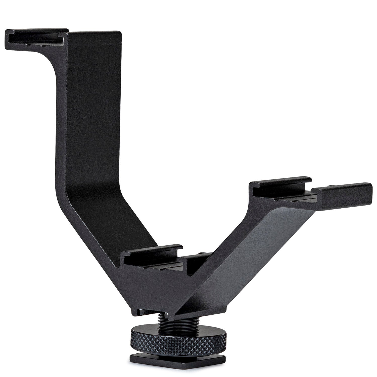 The bracket can attach directly to a camera via the accessory shoe or, additionally, it features a 1/4-inch-20 socket for attaching to threaded mounts such as a tripod.
