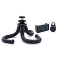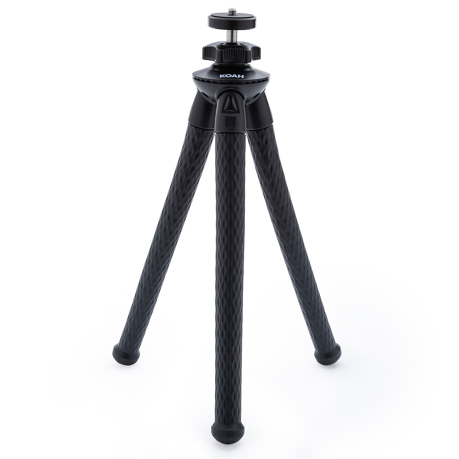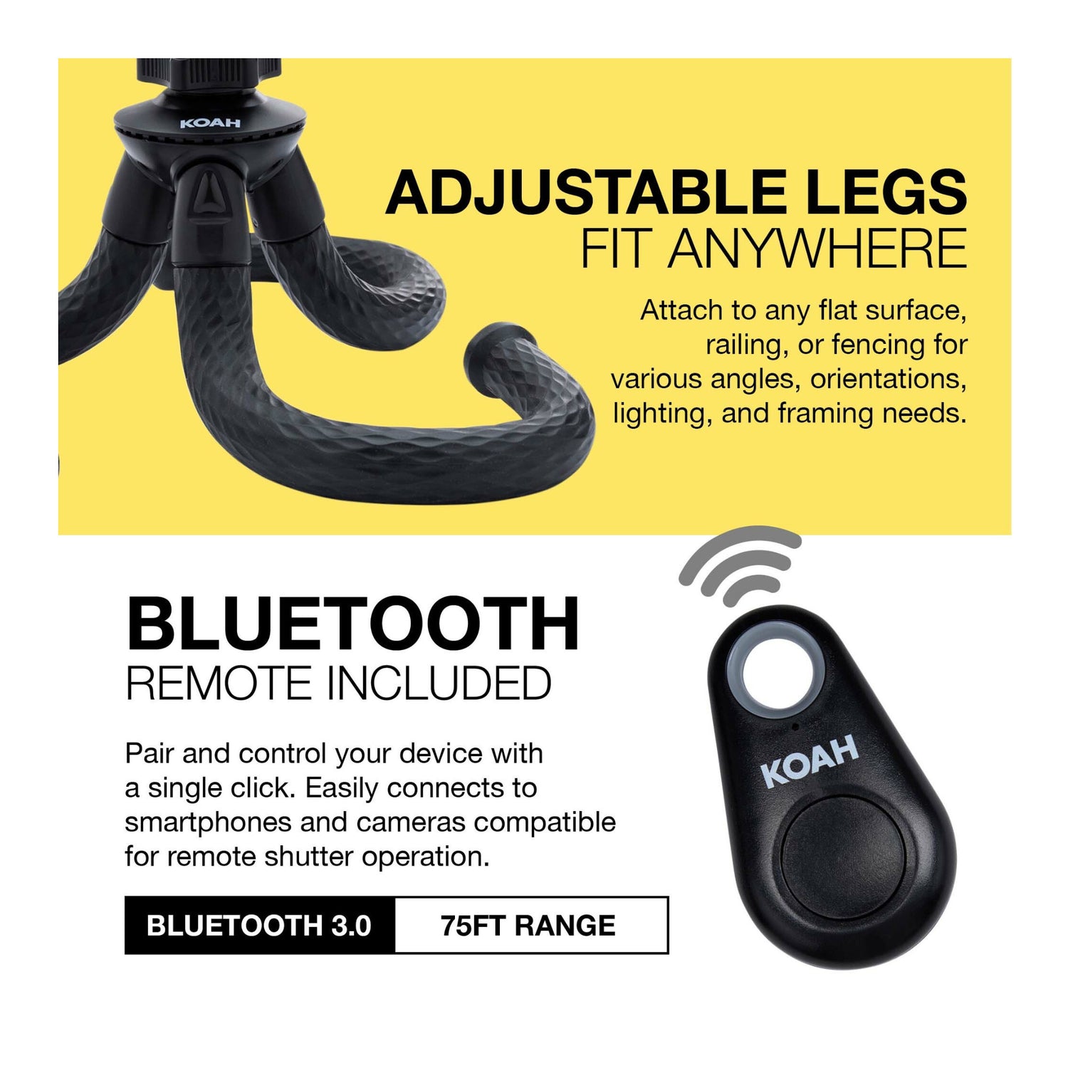 The Koah Kanguru 12-inch Flexible Waterproof Tripod with Bluetooth is a spider-style tripod compatible with iPhones, Samsung Galaxy and other Android phones, GoPro, and select DSLR and mirrorless cameras. Easily mount your camera, phone, ring light, or other device using the 1/4-inch universal thread, phone clamp, or 360-degree panorama camera adapter.