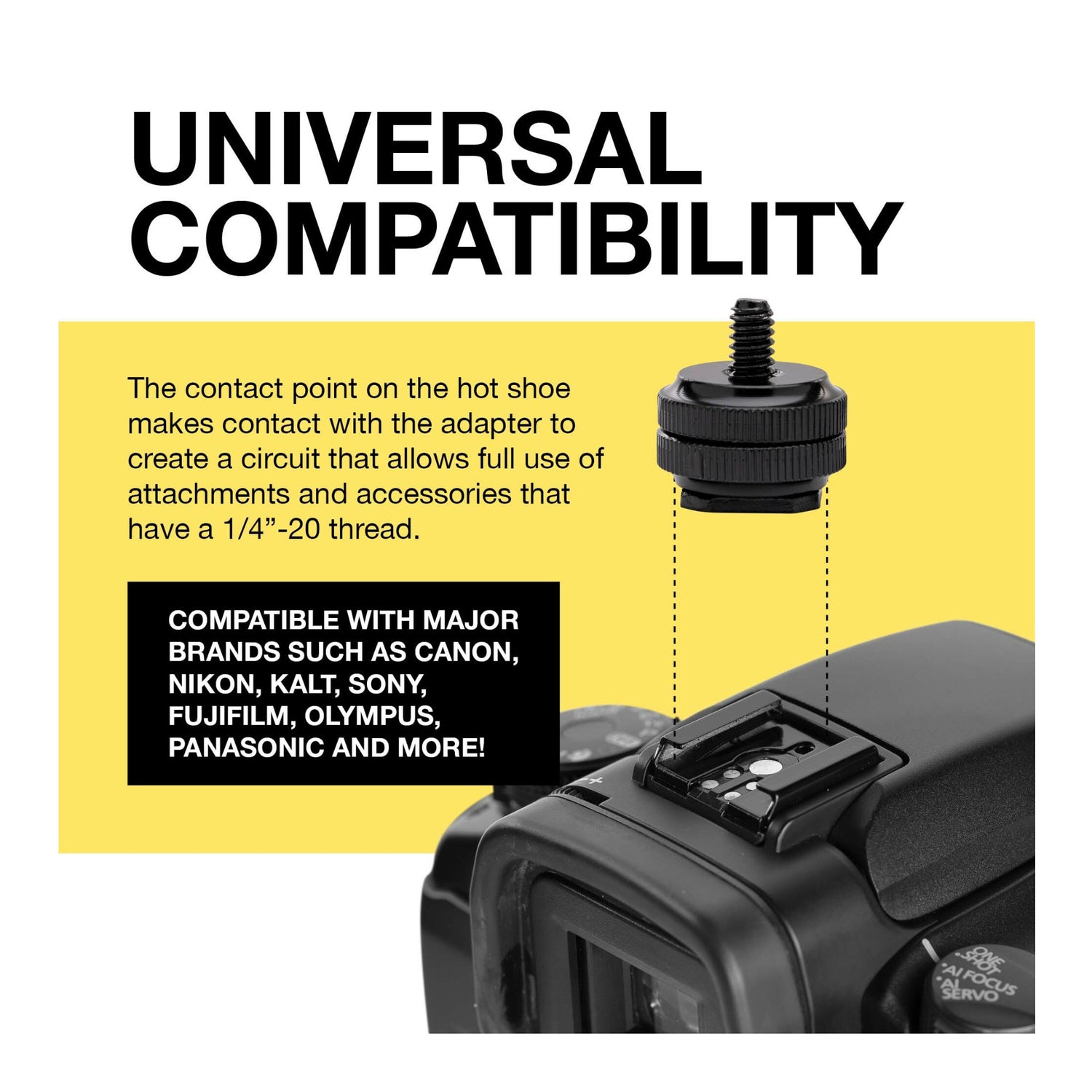The contact point on the hot shoe makes contact with the adapter to create a circuit that allows full use of attachments and accessories that have a 1/4in-20 thread. Universally compatible with major brands such as Canon, Nikon, Kalt, Sony, Fujifilm, Olympus, Panasonic, Pentax, Leica, and others.